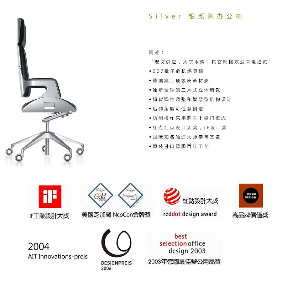 Silver以21世纪第一张座椅,让人再2004年Orgatec(德国科隆国际办公火狐官方网站展)上为之震惊。呈现未来,主打术简风格,国际知名建筑师Hadi大师秉持“产品设计是微缩建筑“的设计理念,追求一种完善的包浩斯理念,即一切风格统一。是Hadi专属的功能和情感的结合,Silver 是我们对建筑的应答,而建筑本身激发了全新的灵活办公环境视野。