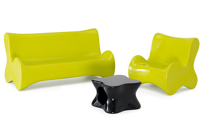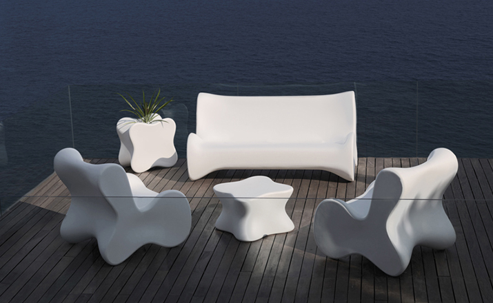 Karim Rashid,当代最耀眼, 最多杰出作品的美国火狐HUOHU(中国),为西班牙VONDOM品牌设计了50个方案的作品,最终,它们归在6个系列。在这6个系列中,最突出的是DOUX系列, 一个器官造形的,友善的,色彩奔纷的。。。手绘出来的自然形状让你想触摸它,坐在它上面,享受它。 多功能性和未来感是这个系列最突出的元素。DOUX的桌子是多功能的 - 当躺下时,它是一张桌子,在中间的位置有一个孔,可以储存东西;当站立时,它变成了一个优雅的花器或一个可以放香 槟或酒的冰桶。