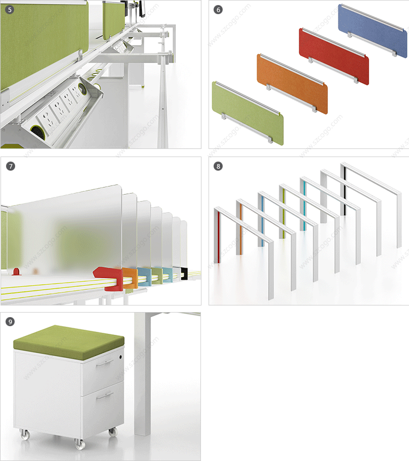 | 5、台下过强弱电过线系统。 | 6、桌面吸音隔板,多选人性化颜色可选。 |
