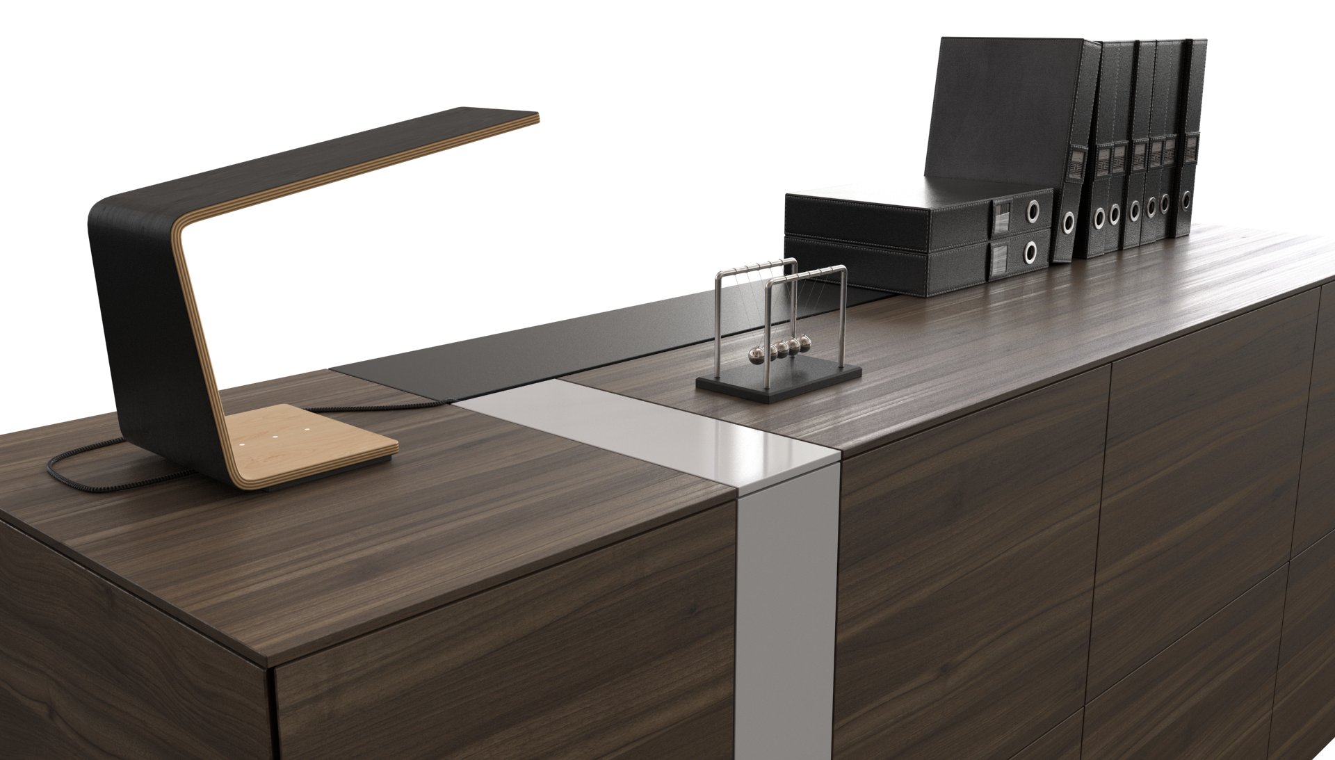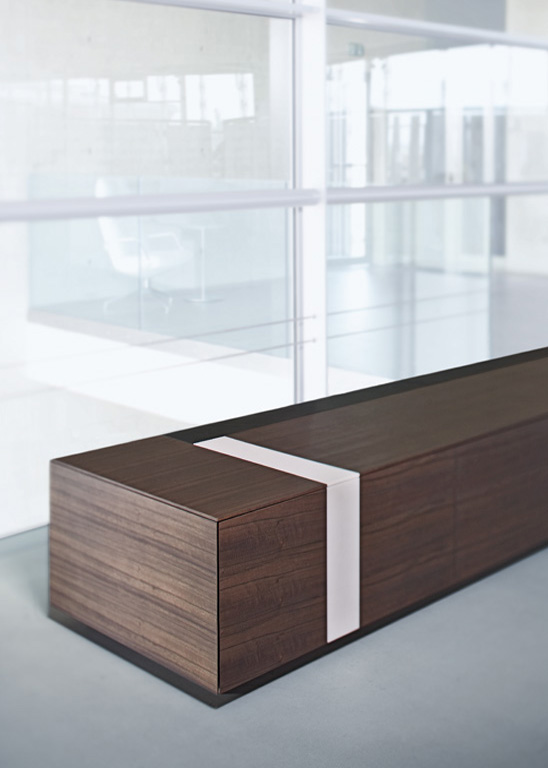 这是EOOS的新总部和会议项目设计团队对该产品强大的美学诉求,这个模型散发着成熟和信任的风格。无论是作为一个单独的会议桌,还是作为一个单独设计的大型会议系统,架构总是保持其清晰性。昂贵的材料创造了一种即时的视觉印象:海洋胡桃木单板和Corian。白色区域隐藏着集成线盒,衔接到各种能源和设备。