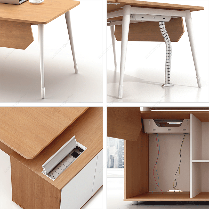 | 1、钢制脚架,实用高端大气; | 2、整齐划一、人性方便的桌面铝合金过线系统。 |