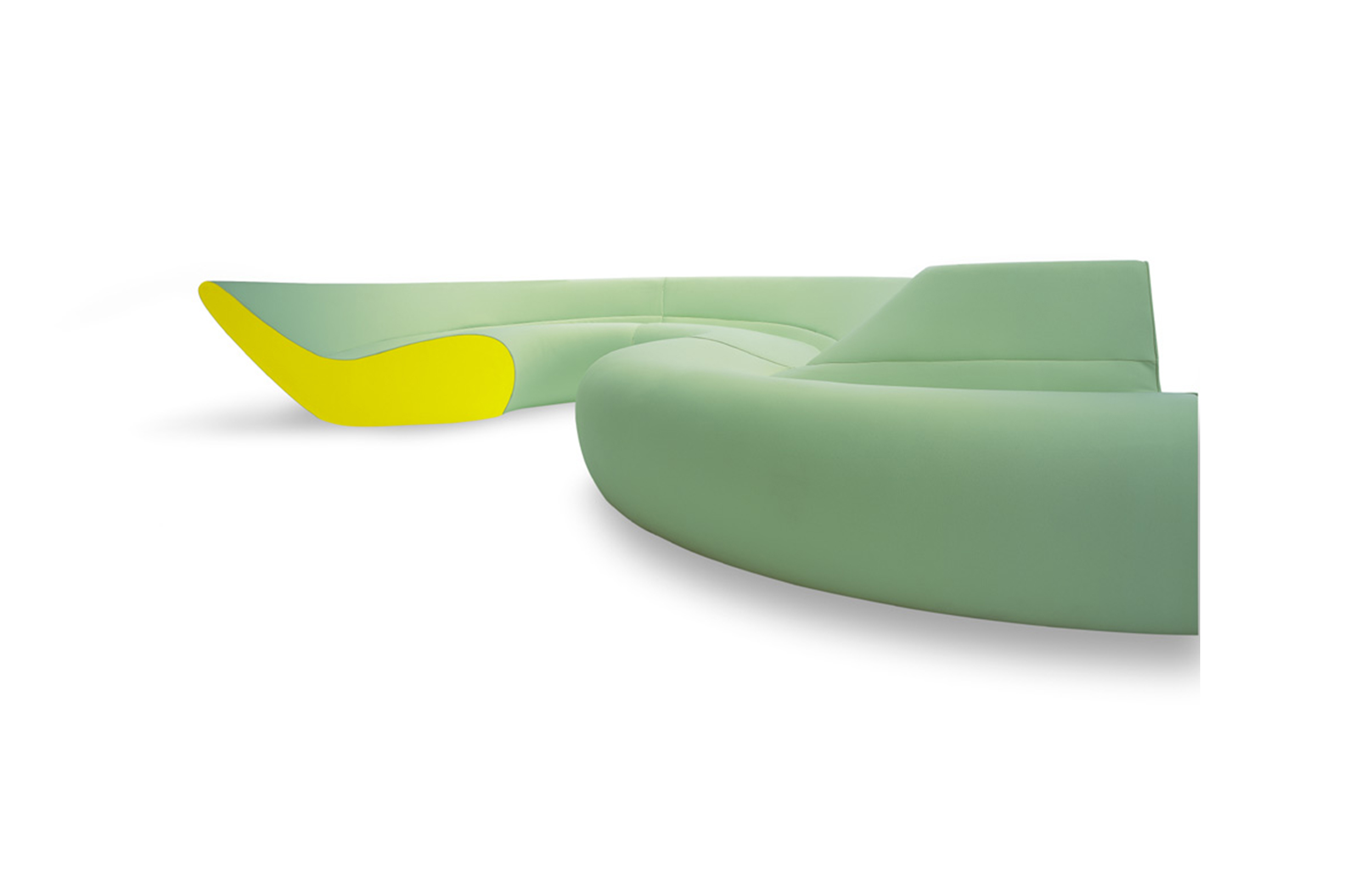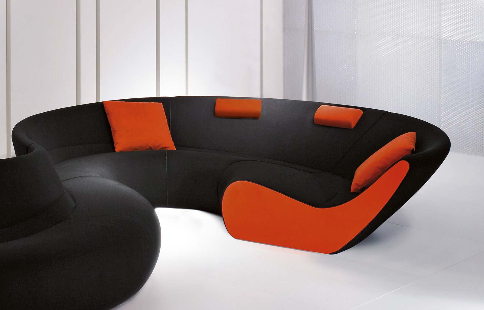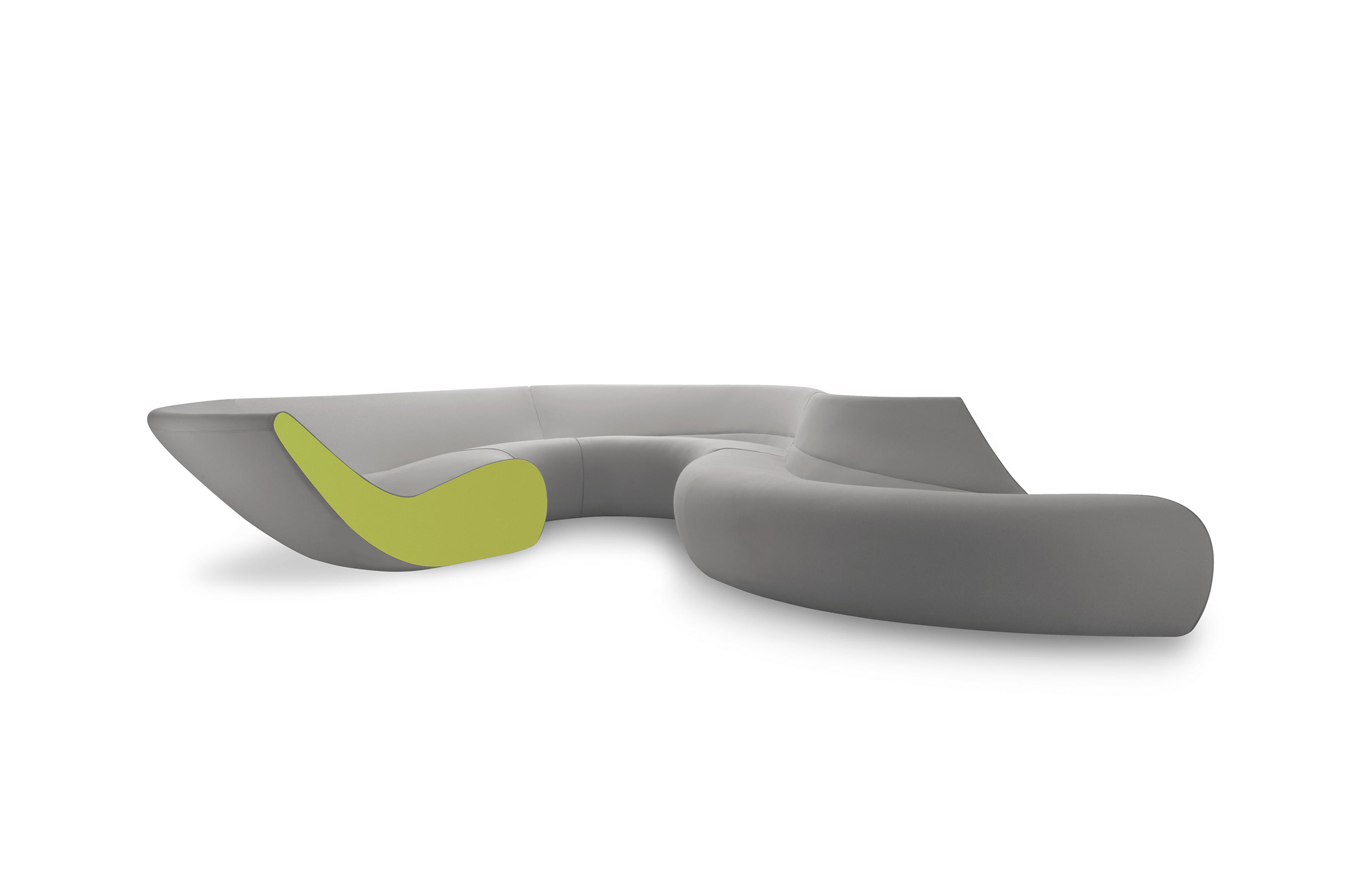 圆椅有四个沙发组成,其中两个沙发可以组成一个半圆,所有沙发都是弧形结构的。背部和休息区的斜率弥补从直立坐着到躺着放松的完整流程。四个沙发其他数据皆有不同只有高度是唯一不变。