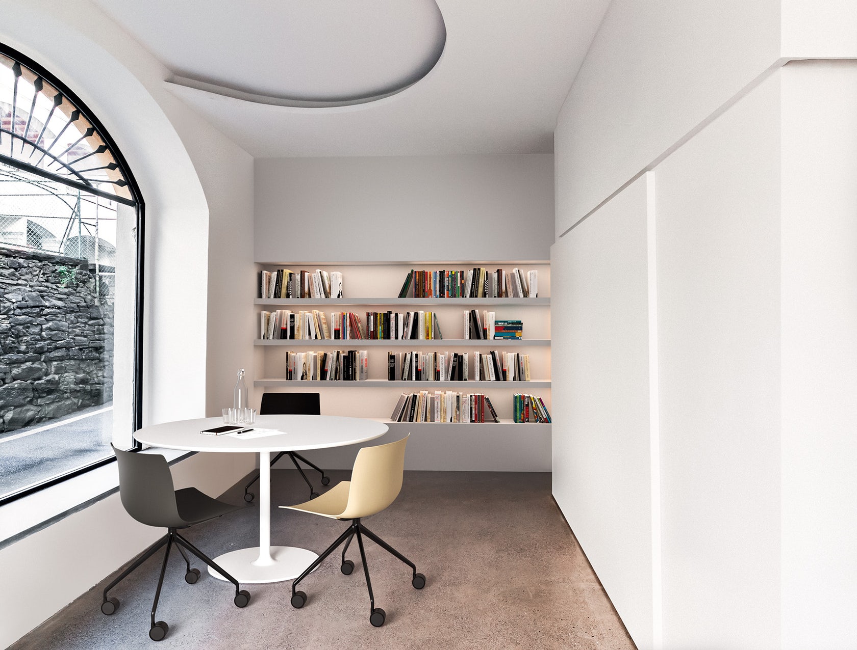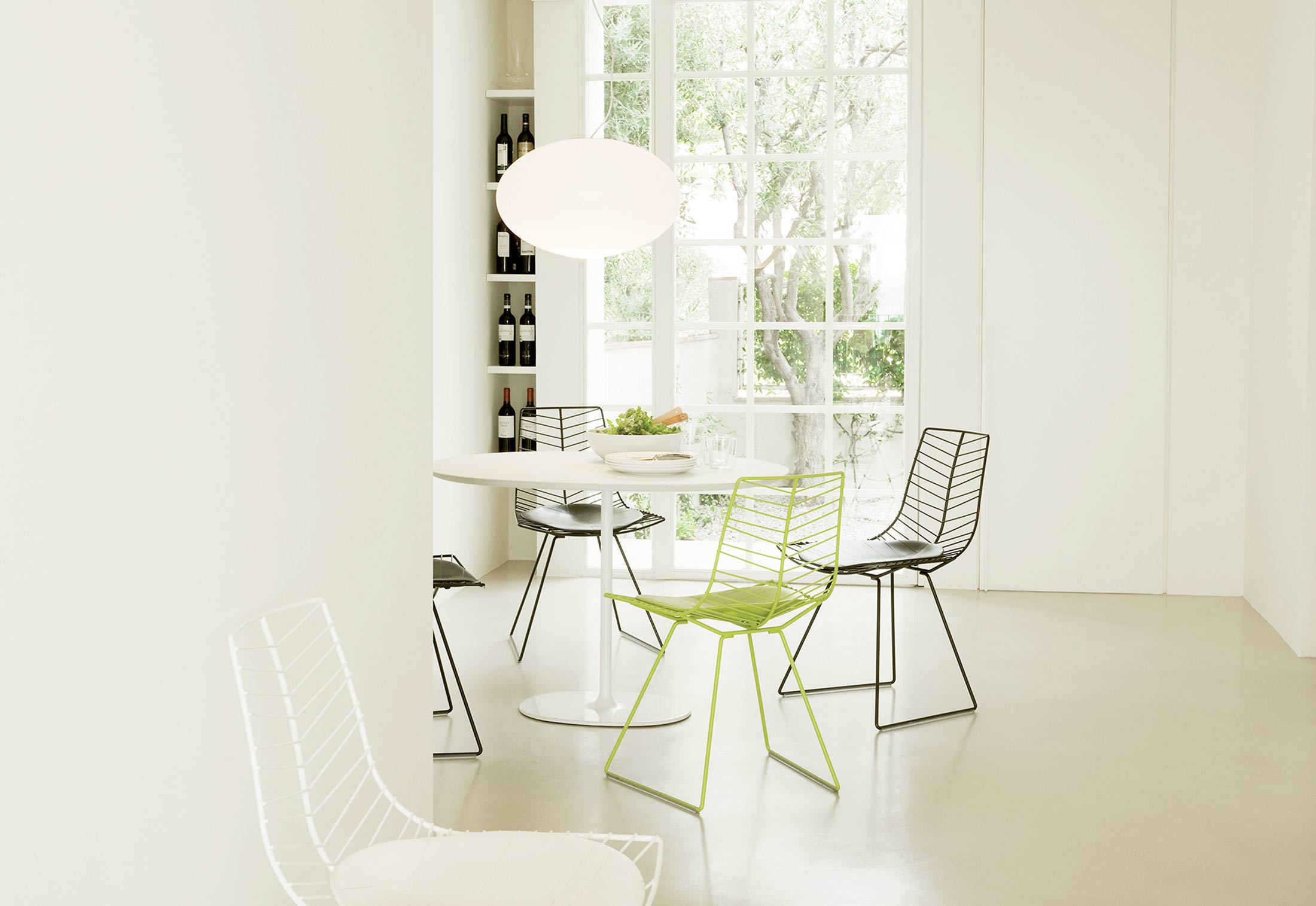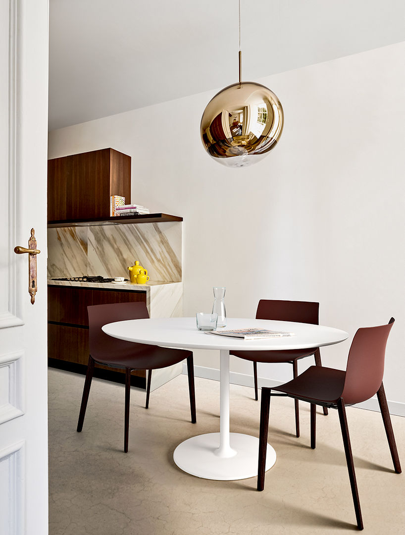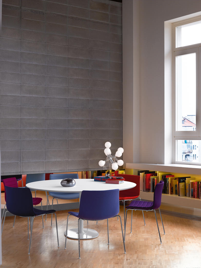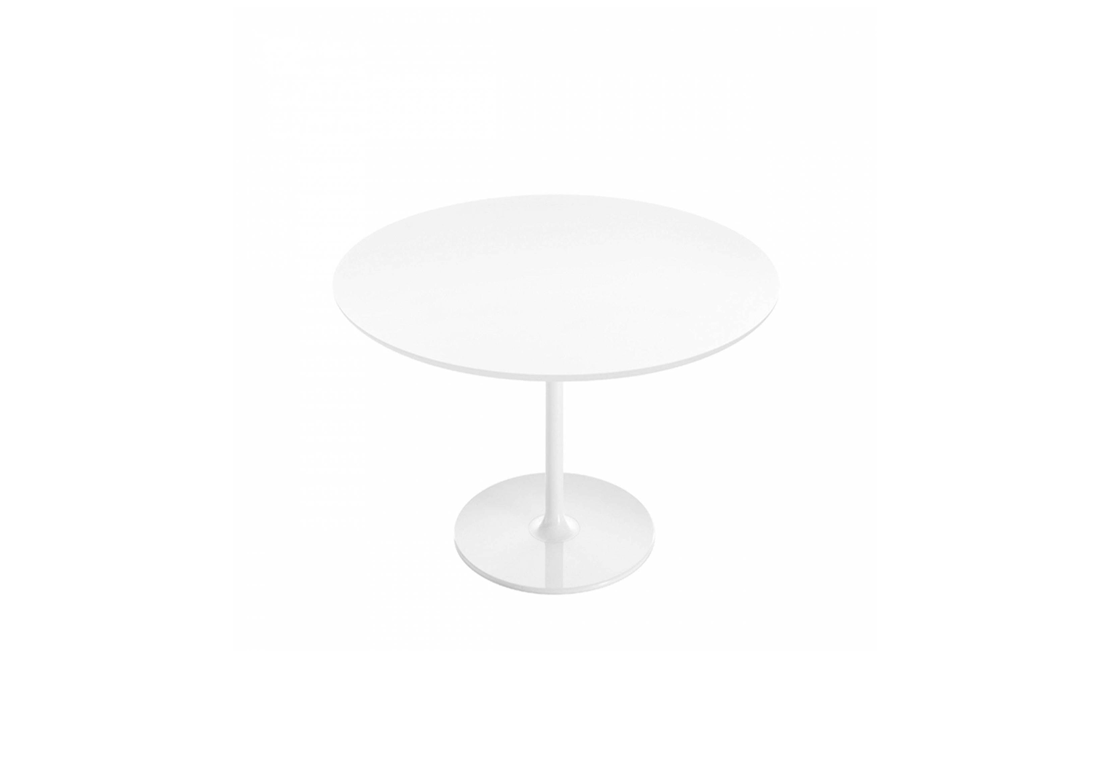 餐台带双椭圆形底座,白色有光泽或黑色哑光粉末涂层钢,顶部为白色压花MDF(厚2.5厘米)或层压板FenixⓇ(厚2,6厘米),有不同尺寸可供选择。 身高74厘米。