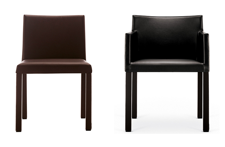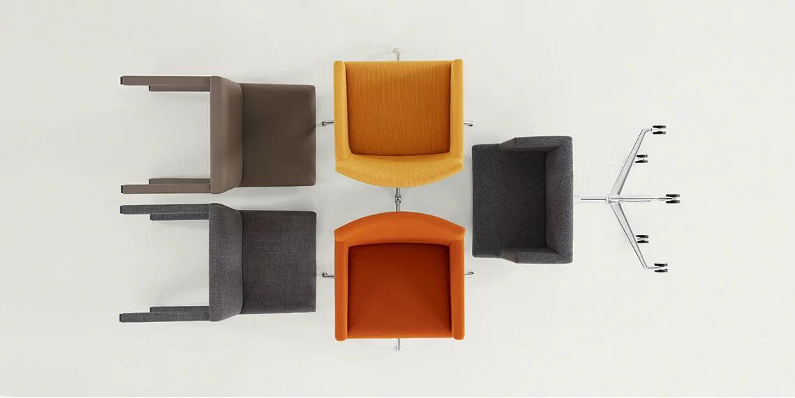 Masai有扶手椅,软垫包括各种皮革和织物。 基本选项包括:四条腿用匹配的皮革或织物覆盖,铝制支架底座带或不带脚轮,铝制五向底座带倾斜和升降机构,带或不带脚轮。
