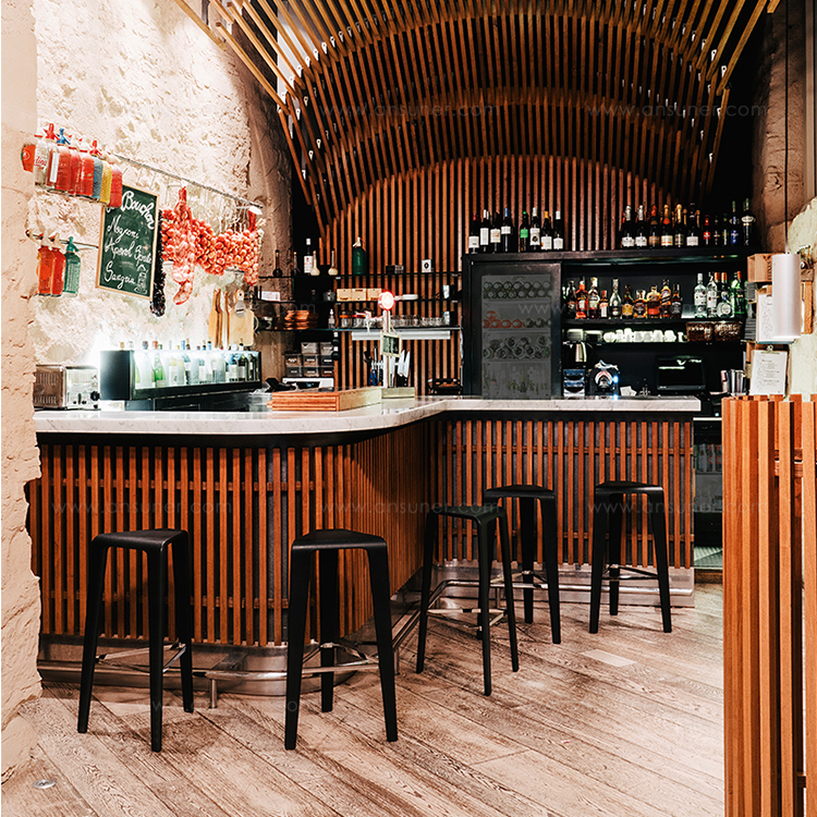 桌子有不同的桌面变化,高度(36厘米和44厘米)橡木,黑色和红色。 凳子有三种高度(44,64和76厘米)可供餐厅和酒吧应用,有两种颜色:天然橡木和黑色。