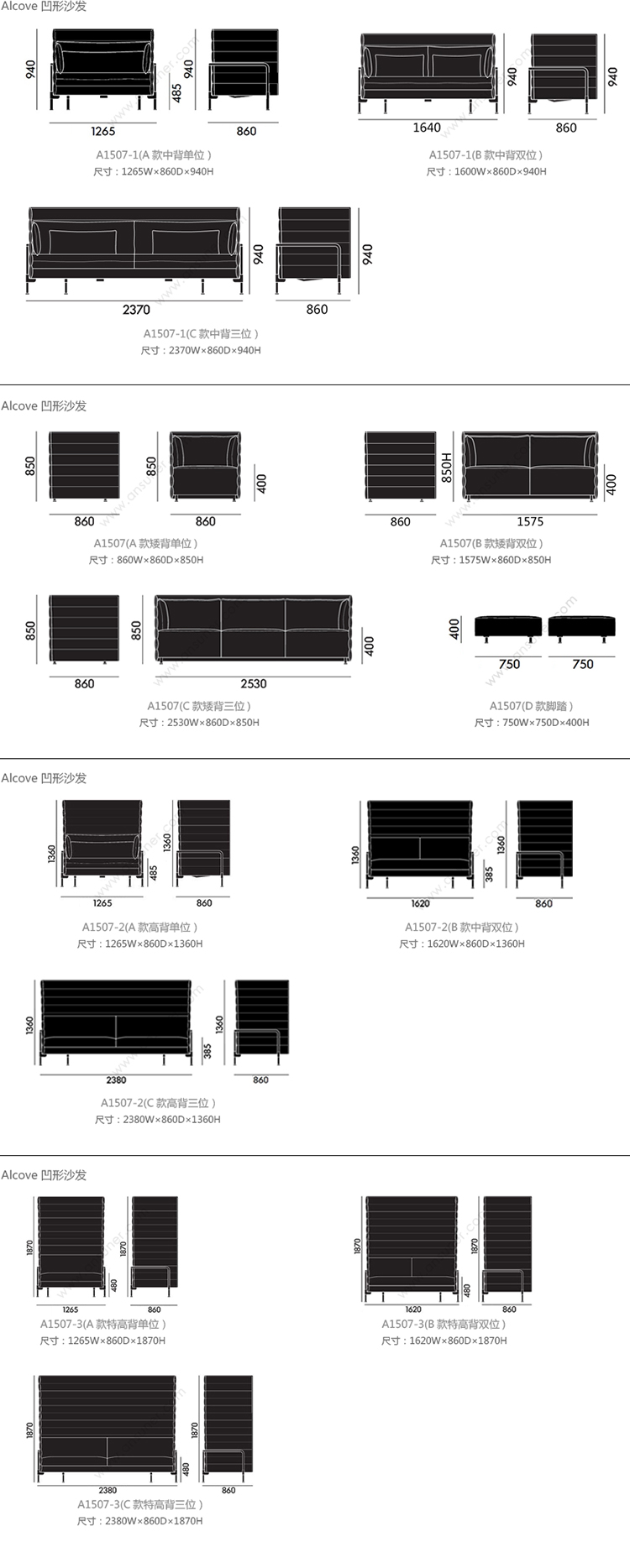 alcove 凹形沙发 系列尺寸/示意图