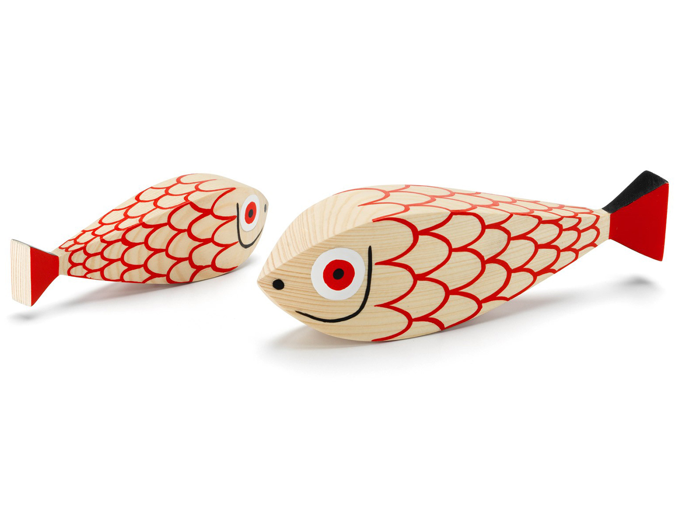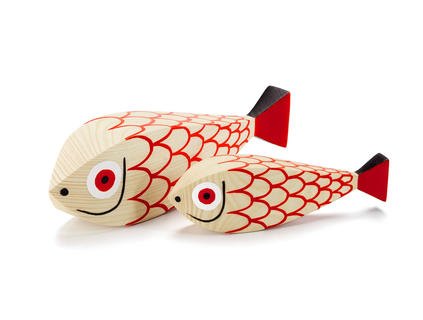 两条鱼 - 一位母亲和她的小母狗 - 将动物世界的另一个主题添加到亚历山大吉拉德的木制娃娃的欢乐家庭中。 它们的水平方向使它们与大型娃娃系列中其他人物的站姿相区别。