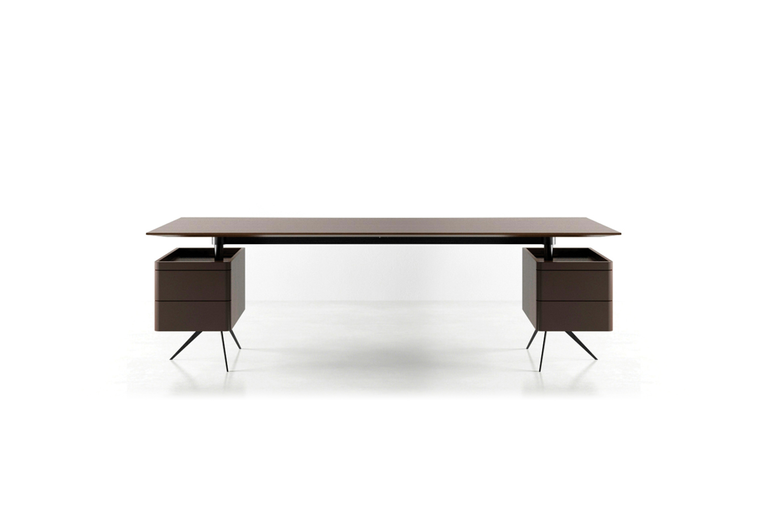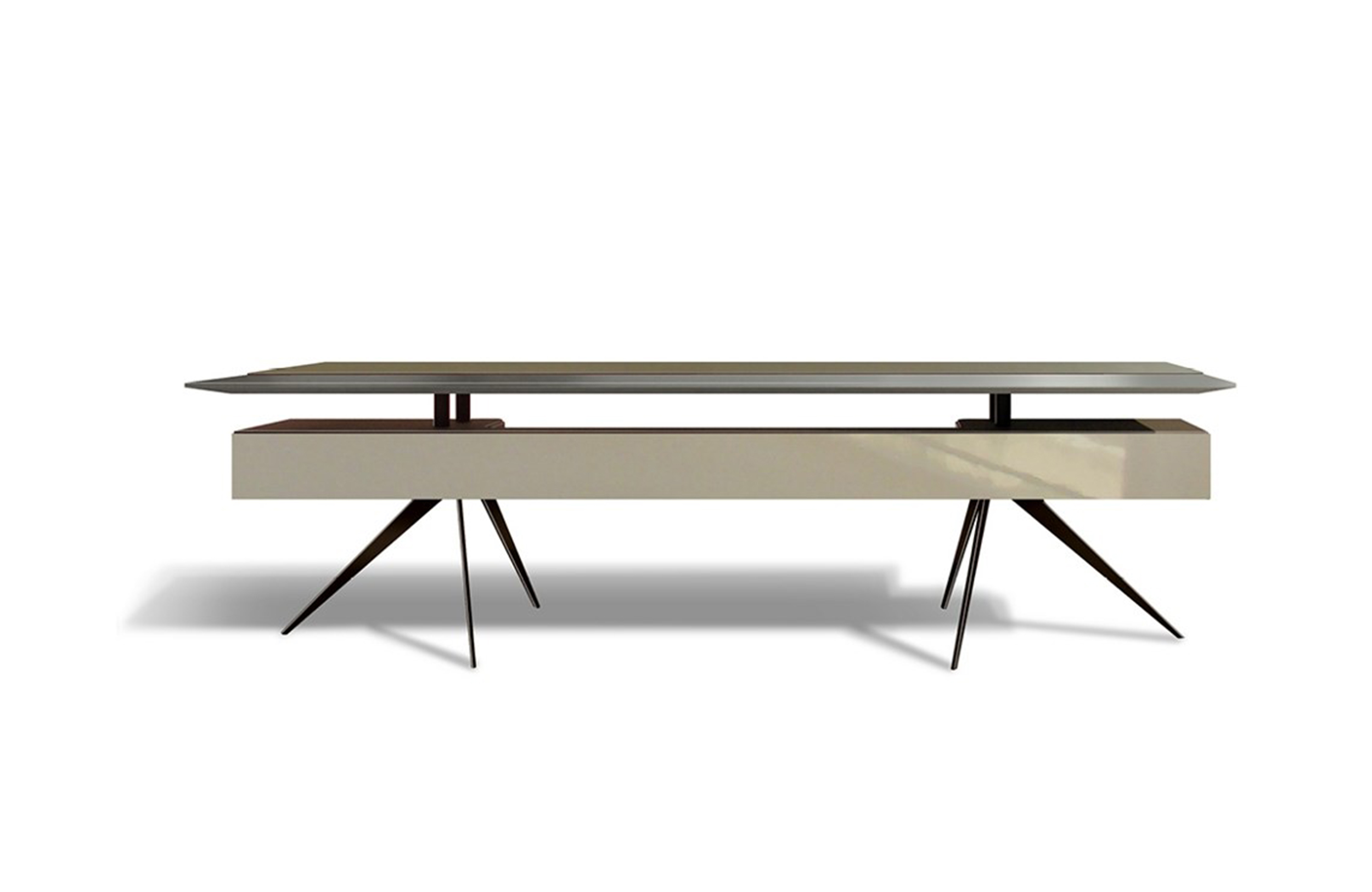 带有工作桌面区域的矩形桌子,装饰有Techno Leather。桌子显然是一个前板,桌子上有一个巨大的抽屉,桌子长度相同。抽屉的顶部和底部采用Techno Leather制成,并在餐具柜上采用天然木材或漆面处理。整体由两个金属结构支撑,有三个倾斜的腿。