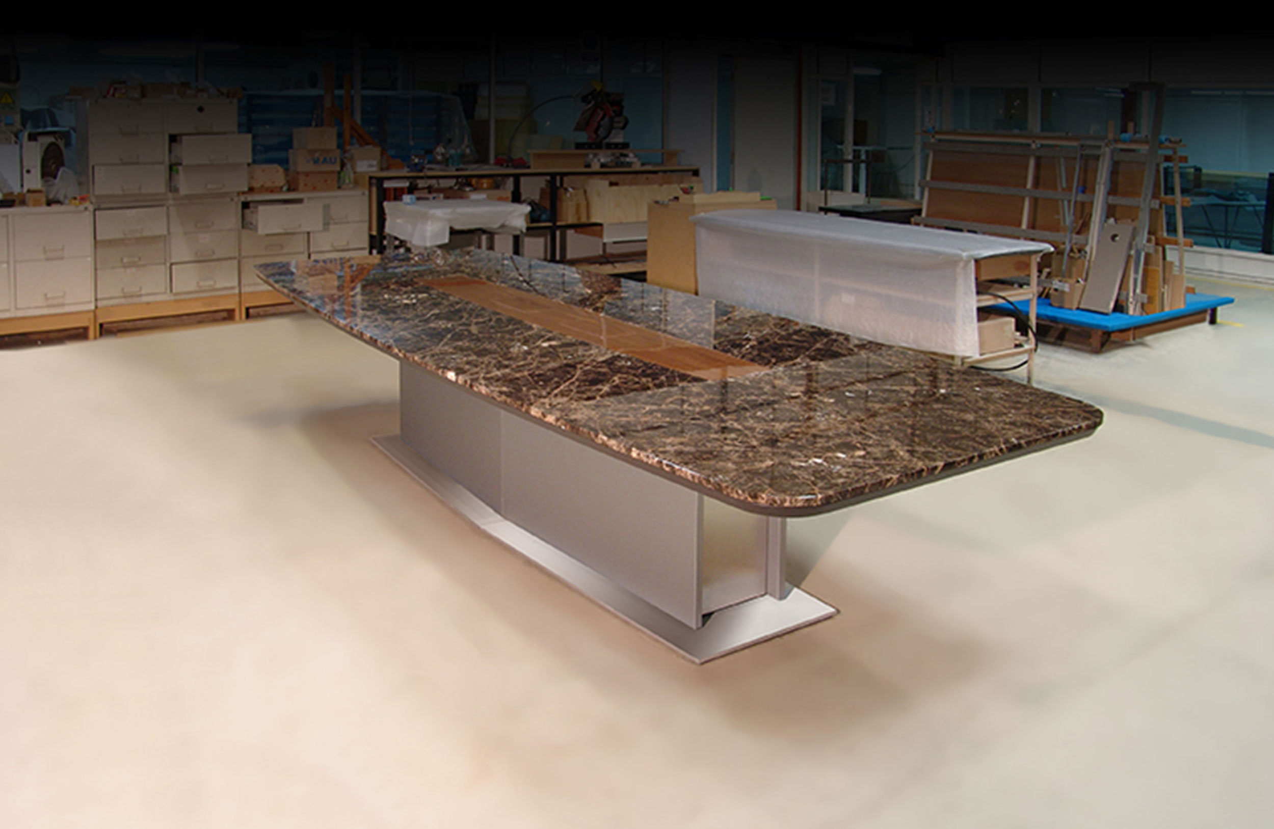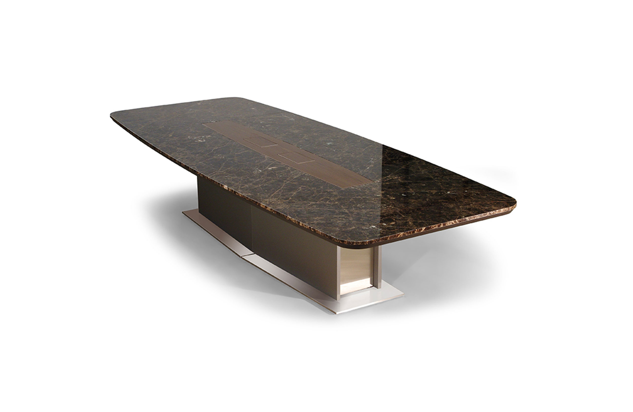 会议桌。椭圆形顶部,直头。顶部分为两个区域:中心和周边,允许不同材料和饰面的组合。50mm厚的顶部由两部分组成:盖子和45o斜面底盖。表专门设计用于集成可伸缩电脑显示器,电缆管理和电子系统的其他部分。底座由隐藏的金属结构组成,封闭有可拆卸的面板,可以方便地进入桌子内部,以便进行电缆管理和维护。表面处理:混合成品顶部采用木材,微纹理漆或Techno Leather软垫。以漆面为基础。