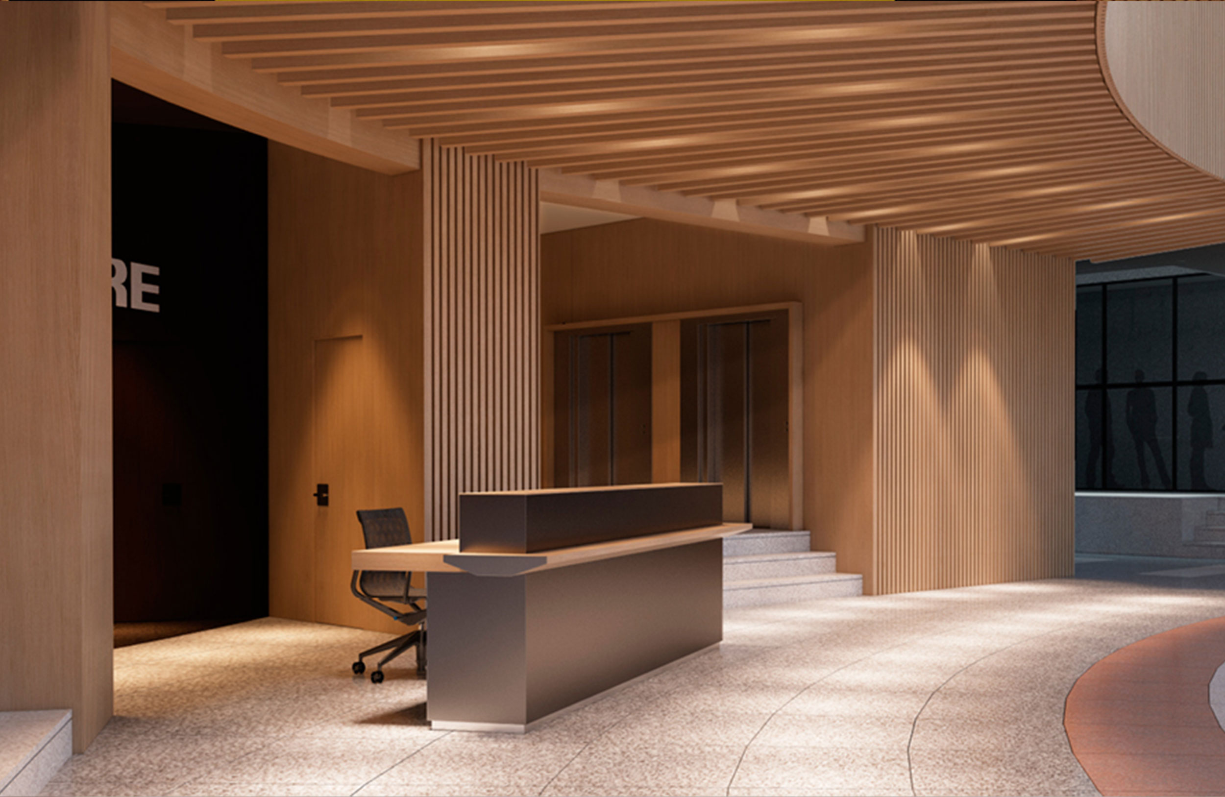 前台。上部区域作为一个利基关闭,创造了私人工作空间。外侧搁板,一侧有突出的悬垂。完成:前板,ALUCOBOND。桌面和架子,天然木材饰面。咨询其他尺寸或形状。