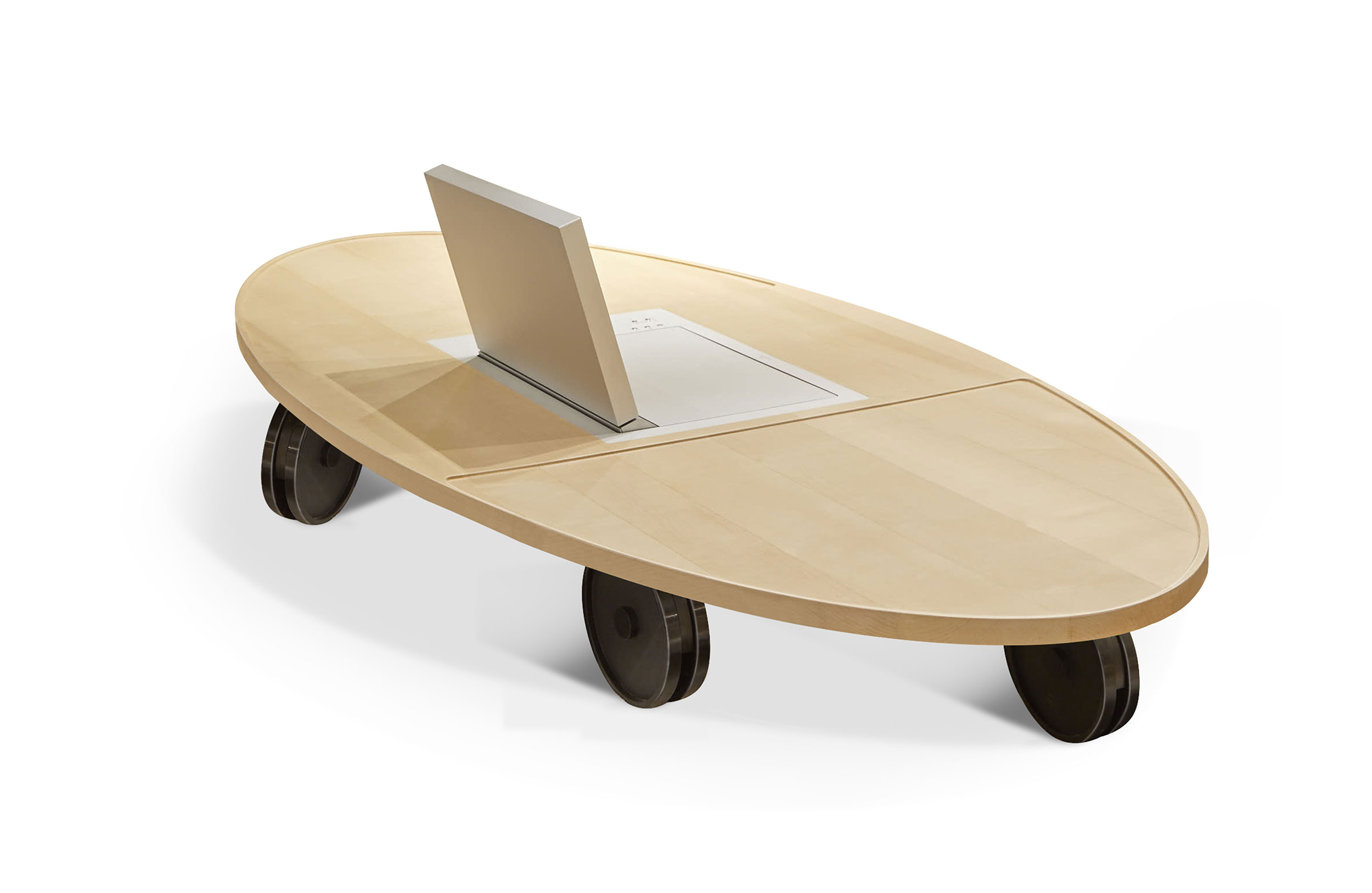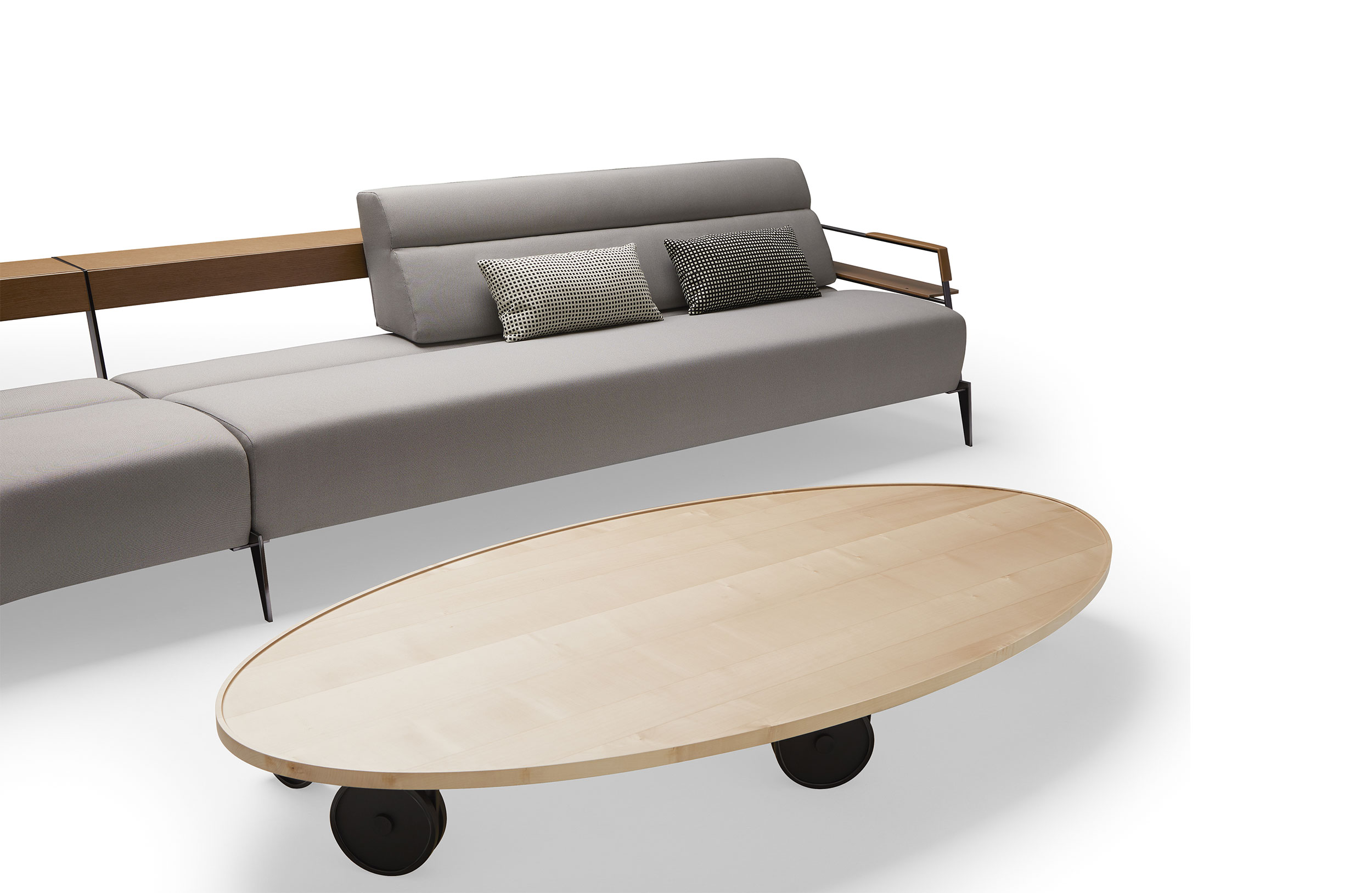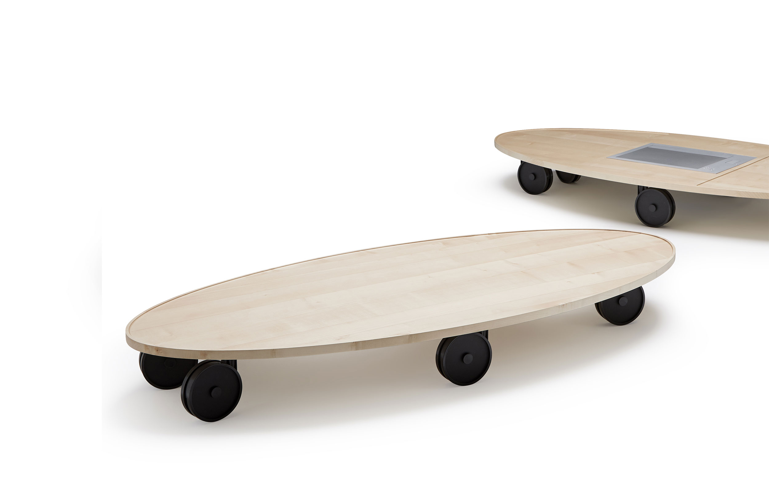 RUFINA | 咖啡桌由在自然木头的上面制成与eliptical形状金属与铸工的被上漆的结构促进运动。