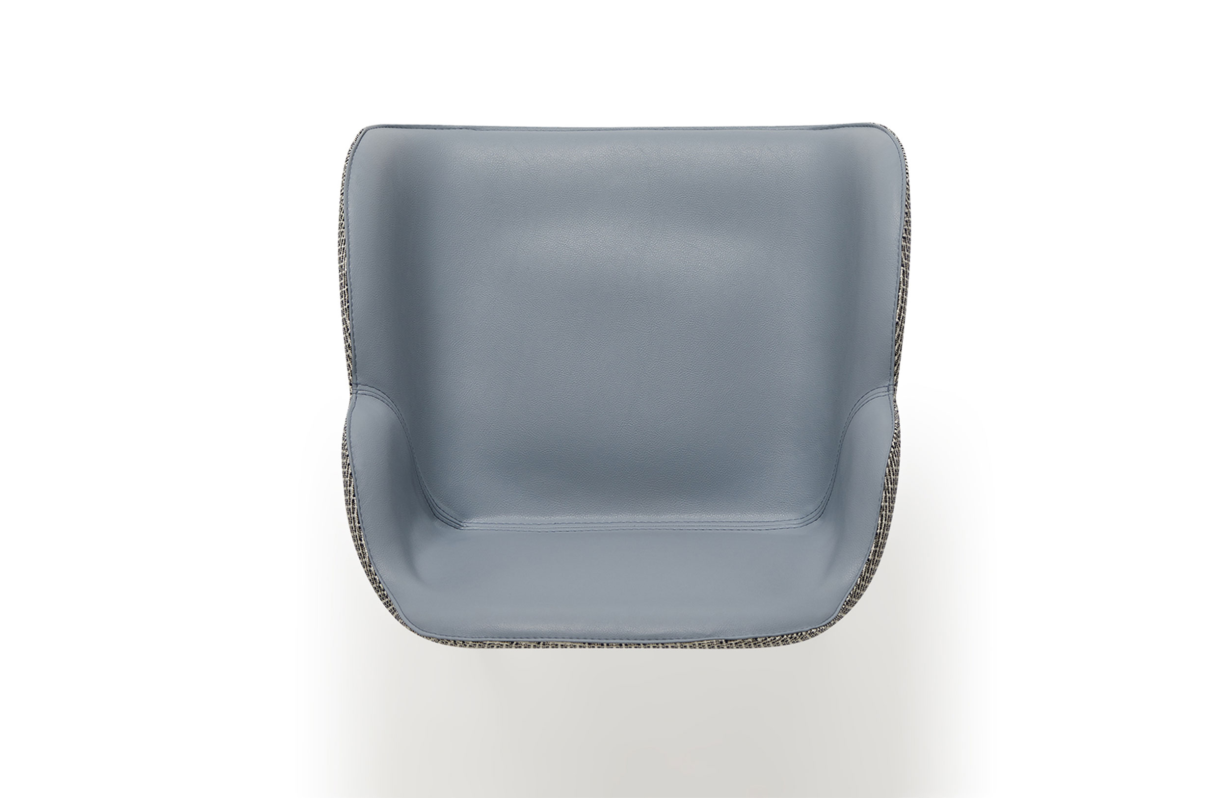 扶手椅的特点是其大胆的美学座椅和最小的结构之间的对比。当代建筑形式几乎处于平衡状态,一旦你坐在上面就会给人一种符合人体工程学的感觉。两个软垫外壳总是优雅地完成了可见的缝合,定义了物体体积和边缘。内部皮革与外部织物之间的对比使得座椅拥抱并且非常舒适,提供适合任何空间(如合同或家居)的组合和饰面的无限可能性。