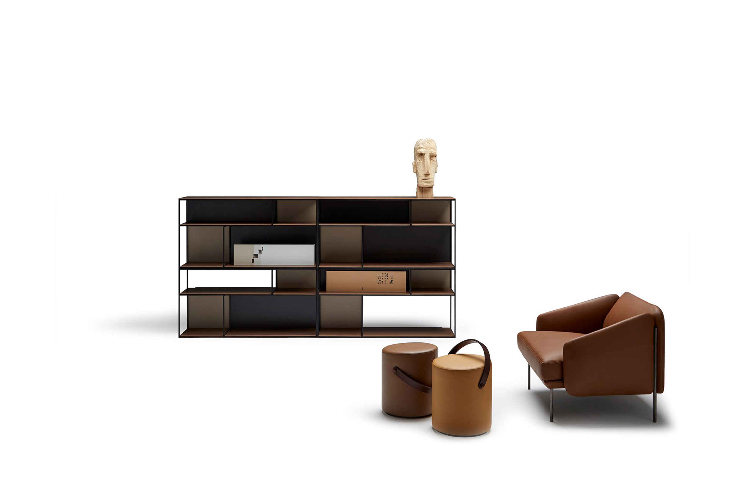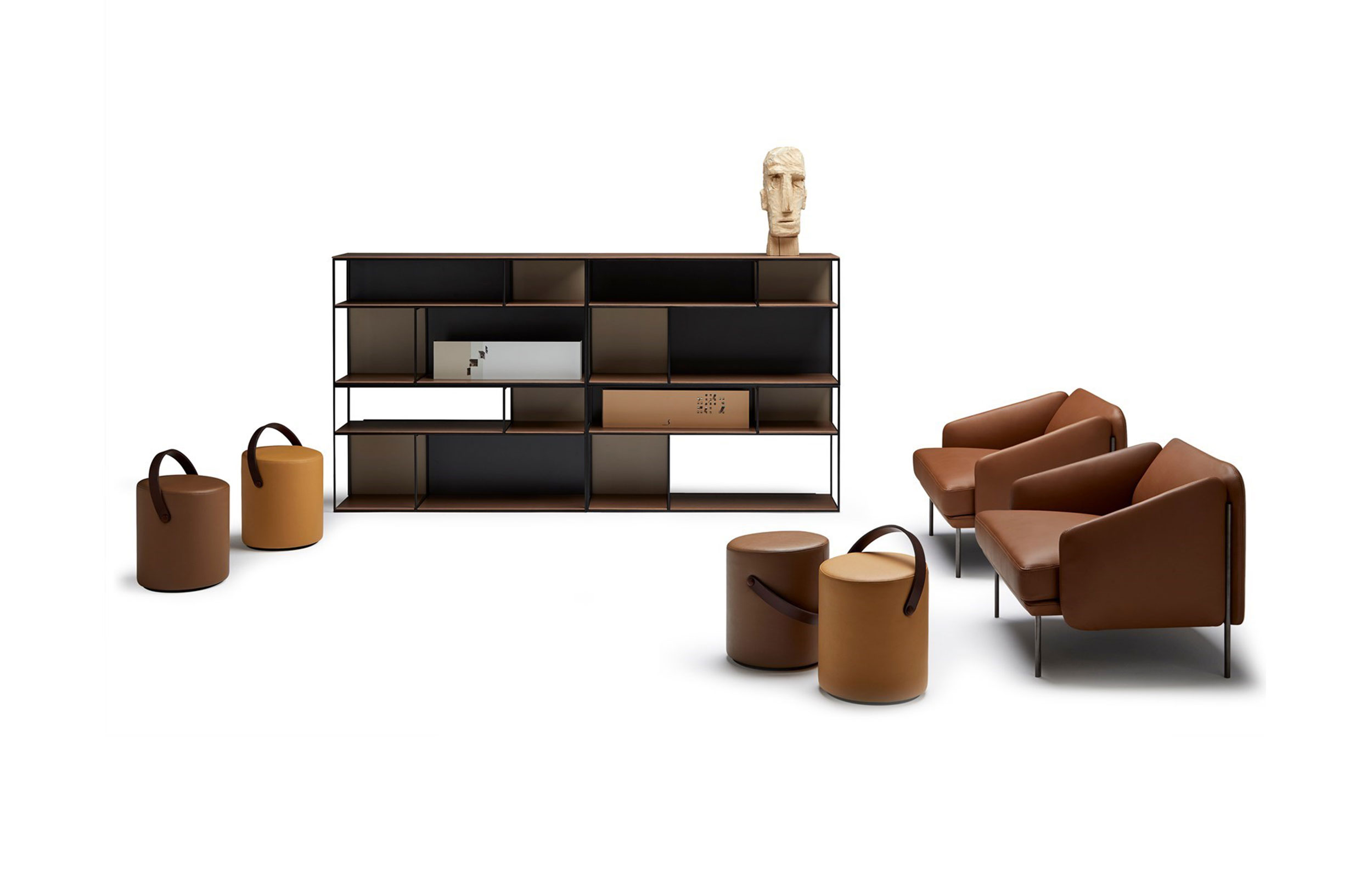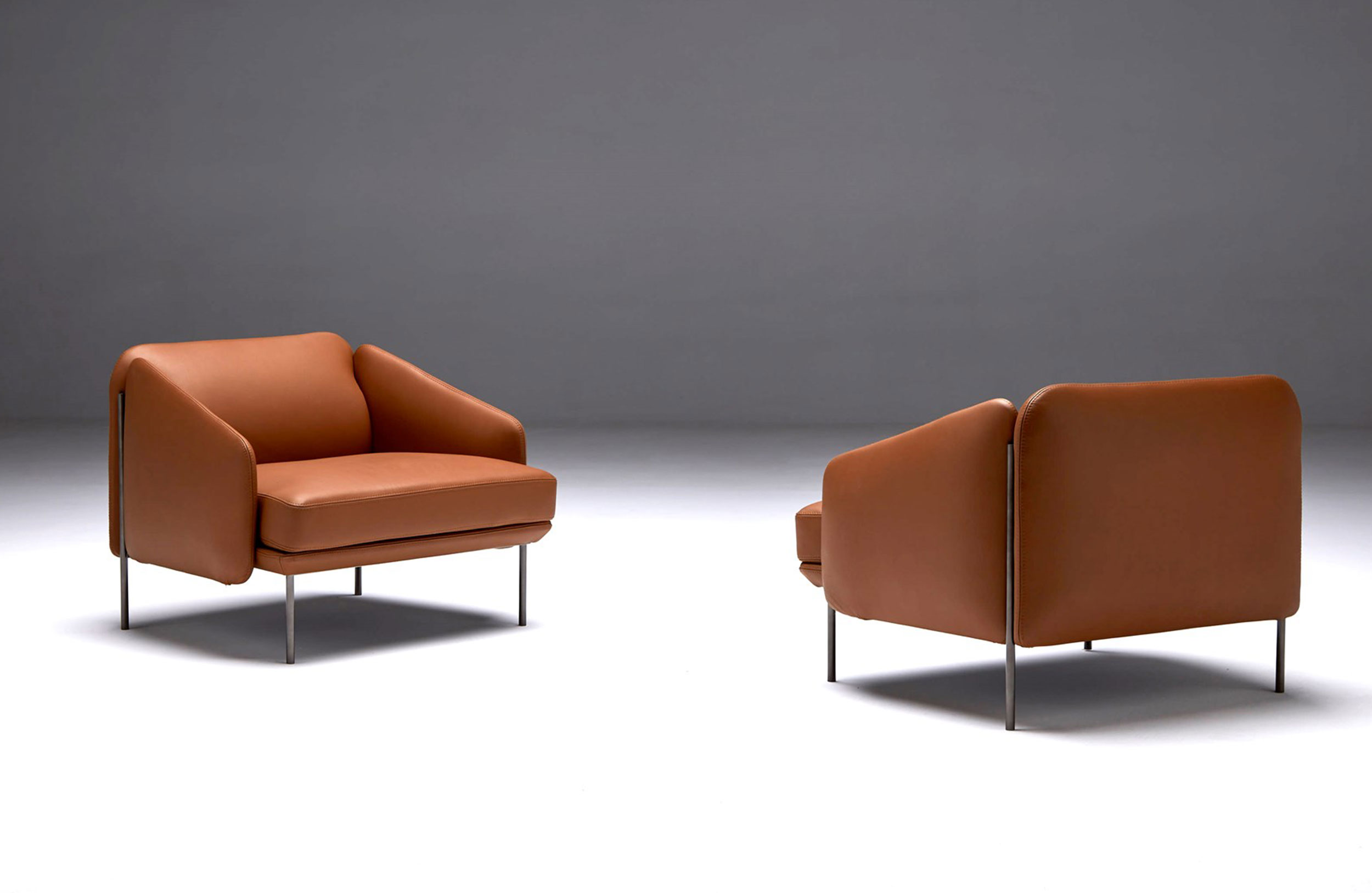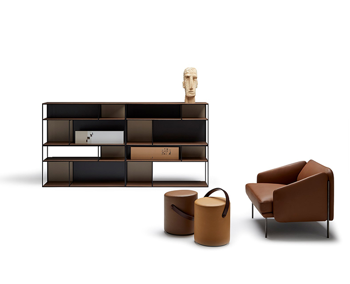 扶手椅和沙发。榉木内框架系带,覆盖多密度泡沫,更加舒适。软垫座椅,靠背和扶手。漆面金属结构。表面处理:金属结构,微纹理漆面。室内装潢皮革。