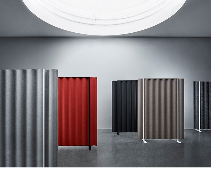 Scala是一个完整的系列屏幕。Scala可以安装在墙壁上,悬挂在天花板上,也可以作为独立式地板屏幕,桌面屏幕和悬挂室分隔板使用。对于地板和桌面屏幕,Anya Sebton开发了由钢管组成的支架,突出了设计的自发方式。
