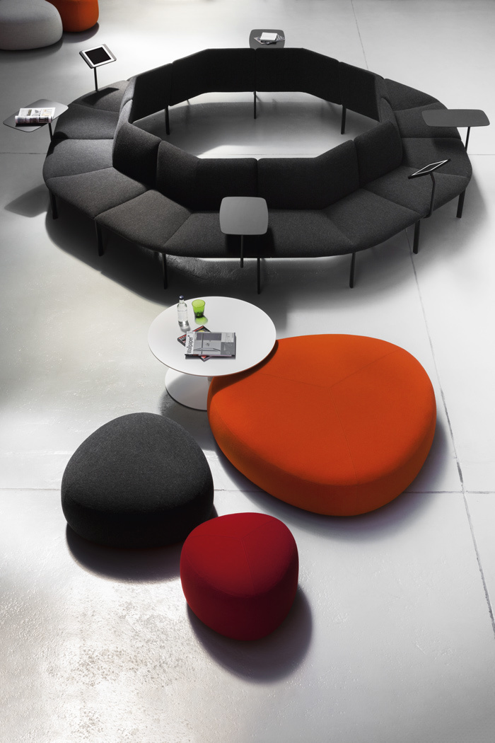 由三个字母和创造力形成,具有多功能性和灵活性,从安排,分离,改变中获得乐趣,无论是餐厅的休息区还是候车室,都是一种创新方式的完美综合,它可以感知室内模块化系统,并配备不同高度的小桌子。在一个数不清的组合中,很好地满足了当代工作环境和空间共享的需要。