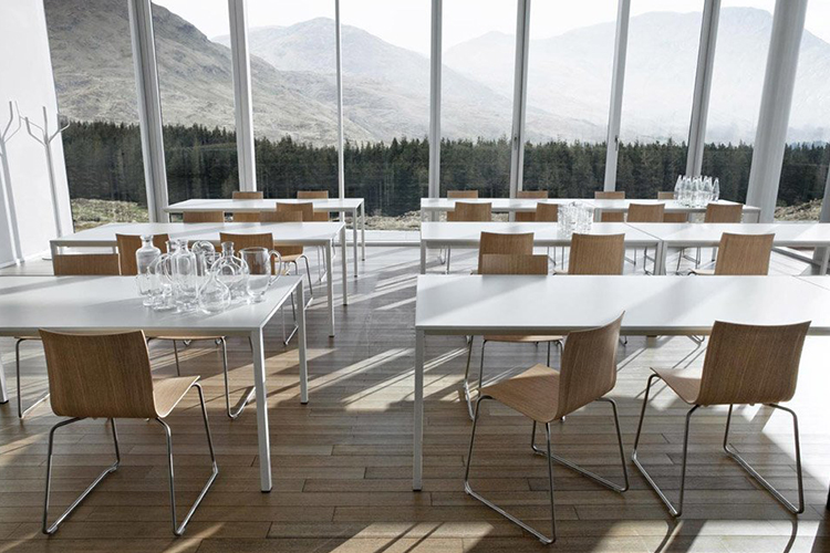 带或不带扶手的椅子系列,也可堆叠,有喷砂不锈钢AISI304框架,可提供多种型号:四腿框架,雪橇底座,脚轮带高度可调旋转座。有厚度变化的木制灯壳灵活性和精细的外形:有几种木饰面,也有织物或软皮革或全软垫的座椅垫皮革制,顶部有缝线。与之配套的凳子配有旋转座和可调高度。列喷砂不锈钢,底座覆盖有不锈钢板和“亚麻布”图案。