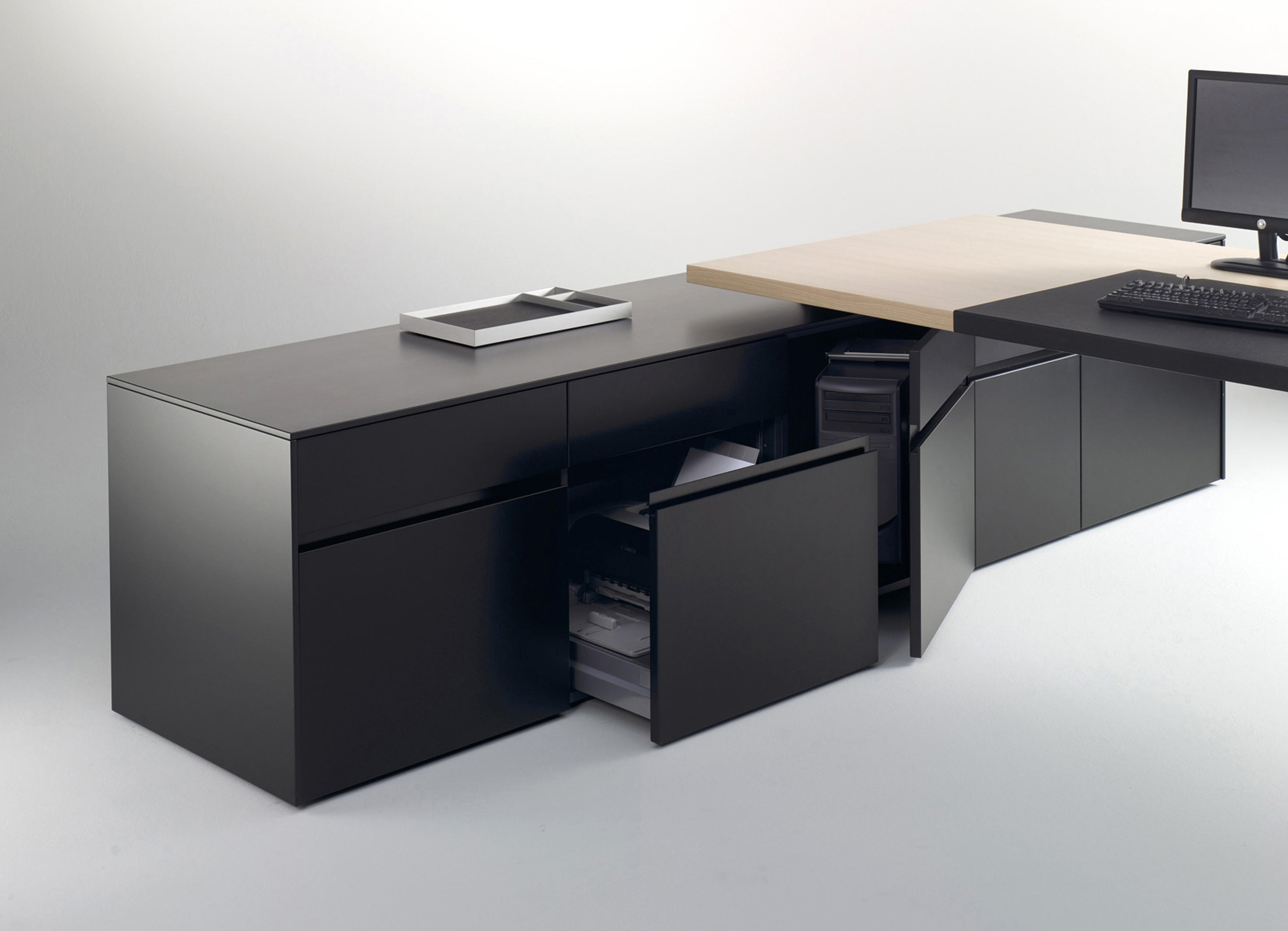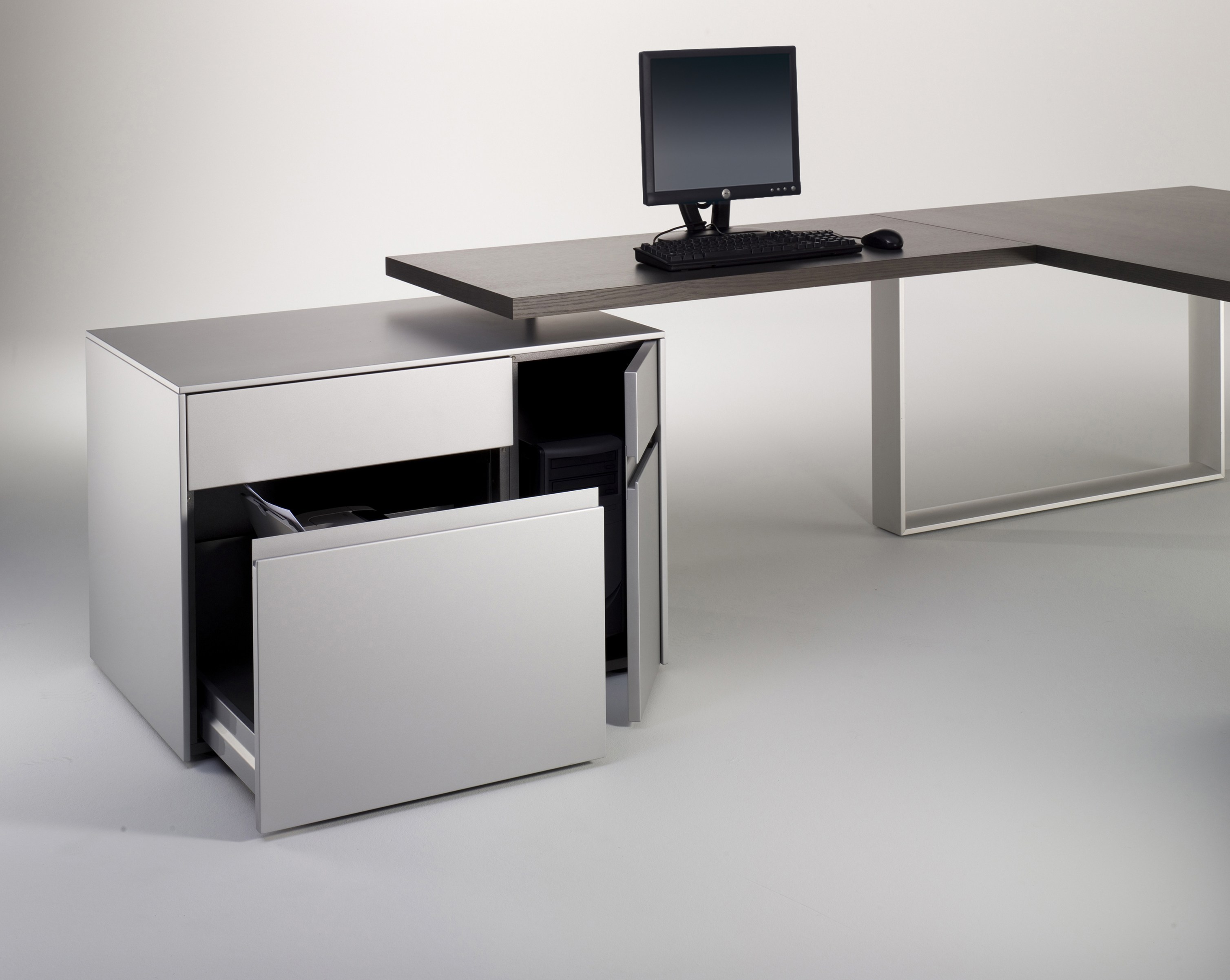 座地柜功能强大,集各种功能,兼具多种色彩选择,可处理成亮光或哑光的表面,灵活组合。兼具PC主机柜、打印机柜、抽屉柜、掩门柜等多种组合。
