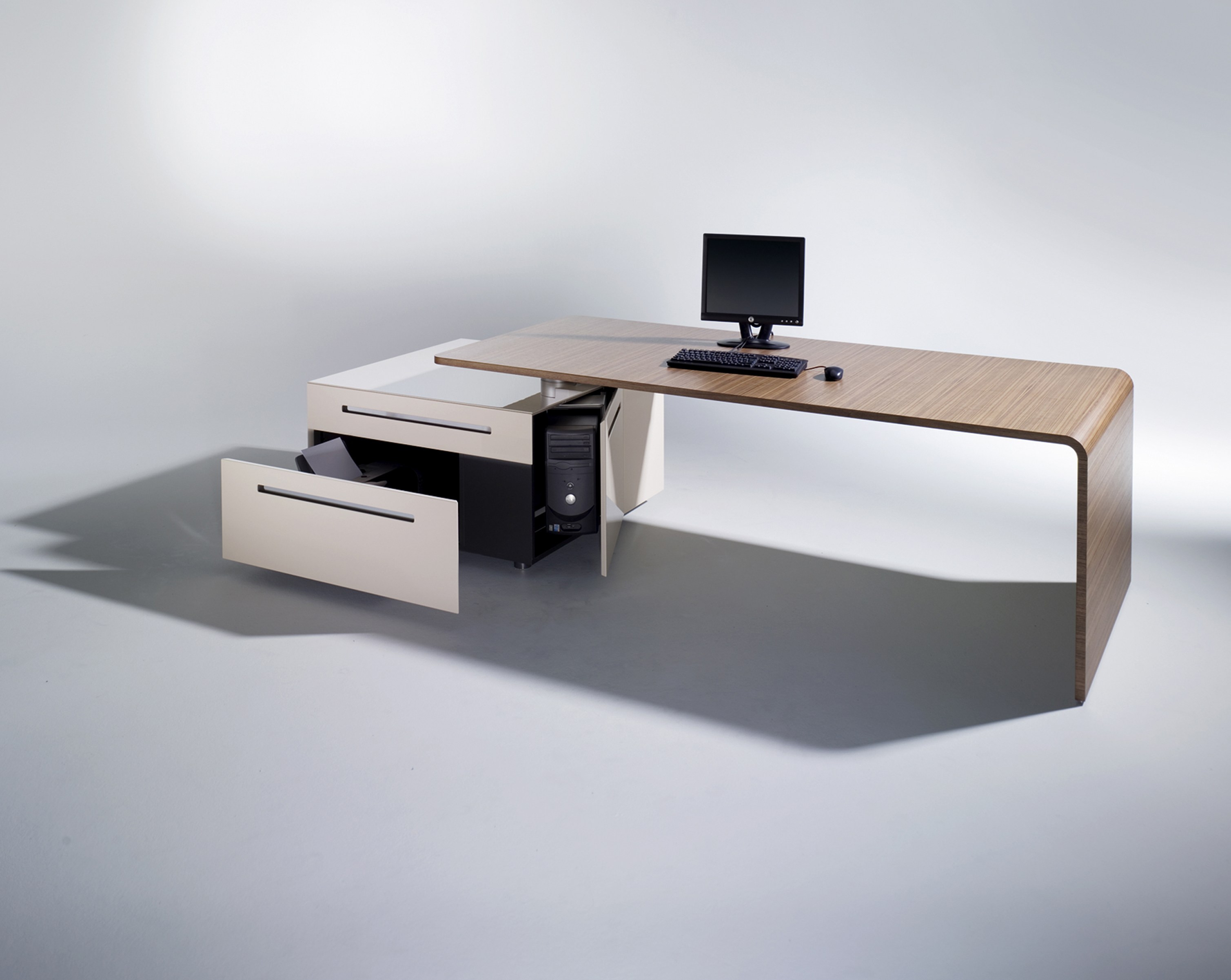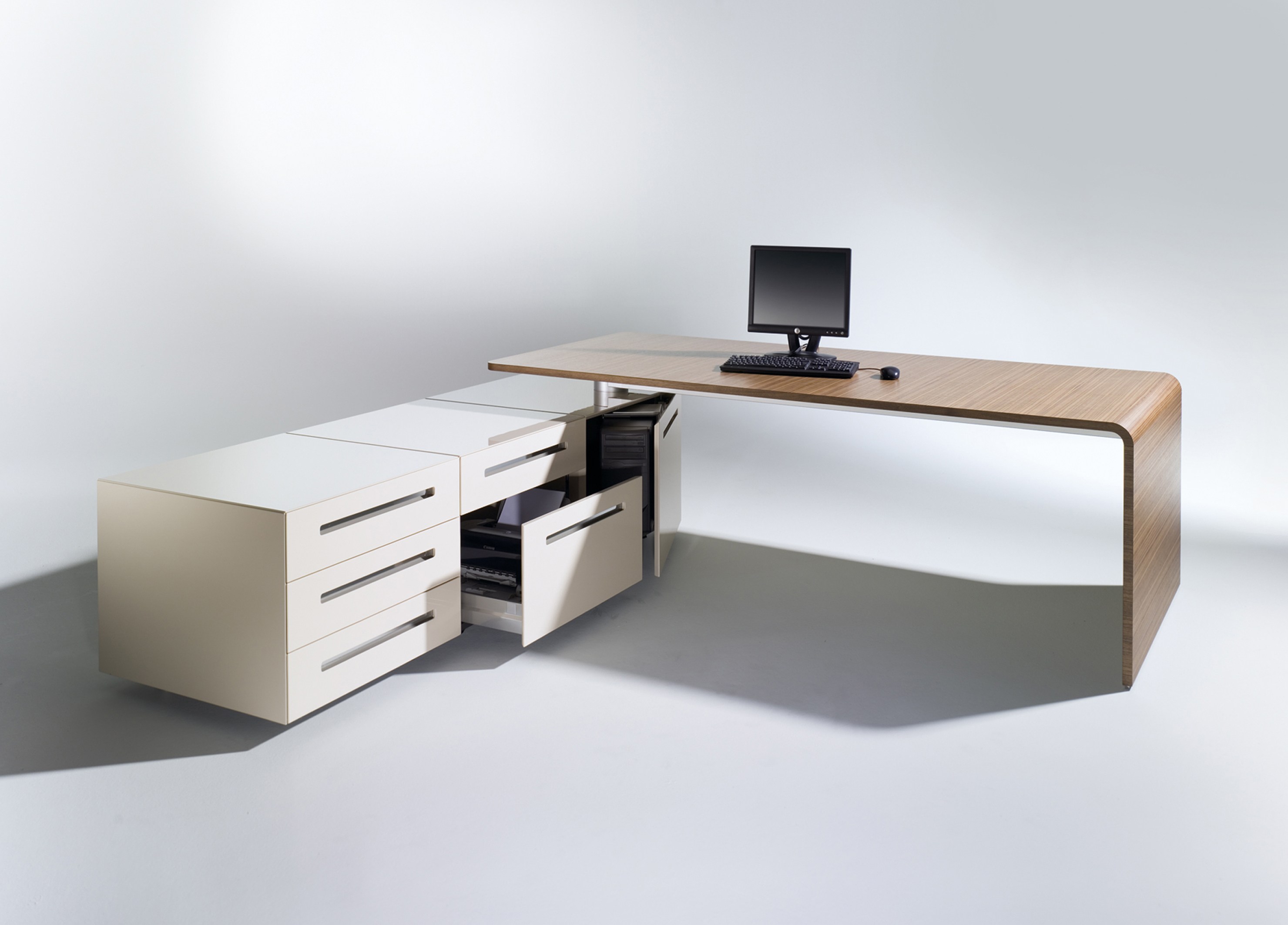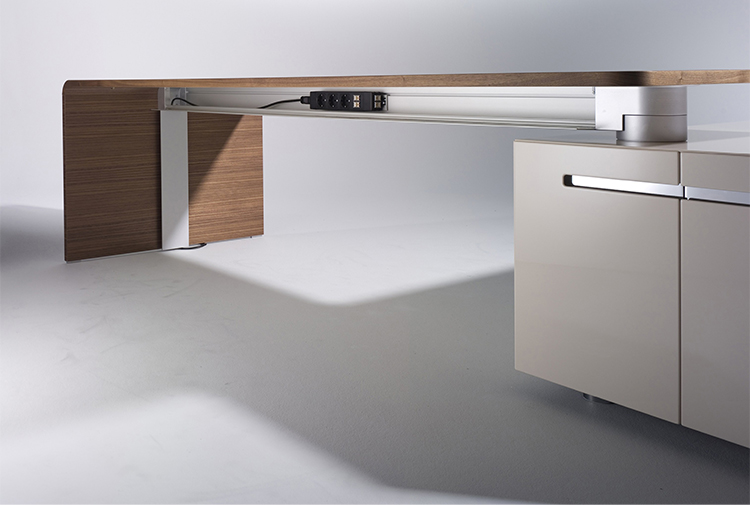 桌面与座地柜以一个枢纽连接,保证了工作位的移动性以及电源供应。桌下的铝管槽可隐藏充电器、变压器、电线等。顶部的电源管理盒可通过底柜或者沿着桌下走线槽走线,保持外观的整洁性