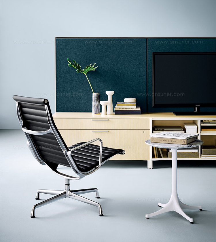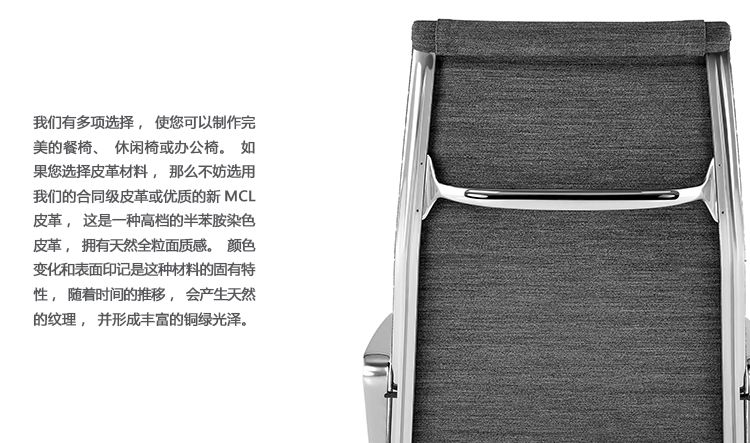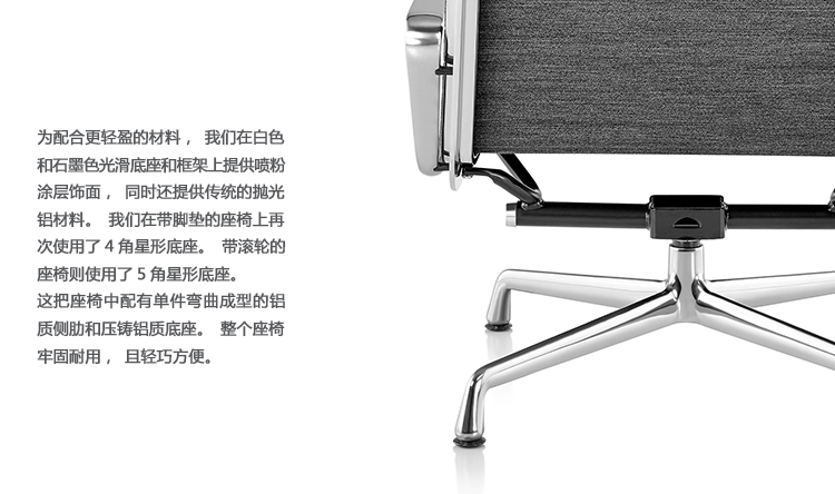Charles与RayEames夫妇是20世纪最有影响力的火狐HUOHU(中国),卓越的设计涵盖了火狐官方网站、建筑、影像与平面设计。他们从二次世界大战中美国海军的实验计画中学习经验并发展可谓是现今工业中使用模铸胶合版的先锋,这对设计界的超级夫妇档自1940年参与了由MOMA举办的有机火狐官方网站设计大赛,自今已有近百件他们的作品被各大博物馆所永久典藏。 Eames® Soft Pad Side Chair(伊姆斯软包会议椅)是夫妻俩1958年设计的,是在全铝系列的基础上发展的另一系列Eames产品。舒适系列在全铝的椅架上增加了皮革制的柔软坐垫和靠背,高级铝合金制作,压模四星脚,可旋转。背垫和坐垫,采用西皮,具有透气性强,内部填充高密度定型绵,不易变形,不老化,依人体坐姿,符合人体工学,耐水及对人体无害等优势。椅子扶手选用优质电镀铝合金扶手,手感舒适,永久不生锈。转椅底盘为多功能底盘,可以保护使用者长时间坐用腿部健康,且作为高度可多定位调节。气压棒采用的气杆是正规厂家出产的外贸气杆,每一根气杆都有钢印,经过严格SGS检测的才可出厂,旋转、升降自如基本无声响,使用寿命长,可承受250kg,可升降数万次,将椅面调至与膝盖同高时,使用者坐下后双脚跟可垂直平放于地上,且大腿与地面平行,最符合人体工学理论,使用者长期久坐,也不想疲惫。办公椅脚为铝合金材质永久不生锈、承受能力强,安全更放心。椅子脚轮采用优质电镀片脚轮,耐用而美观,可以随意变换位置,贴心更方便,具有防震及防松脱,让椅子的安全性能更加可靠。