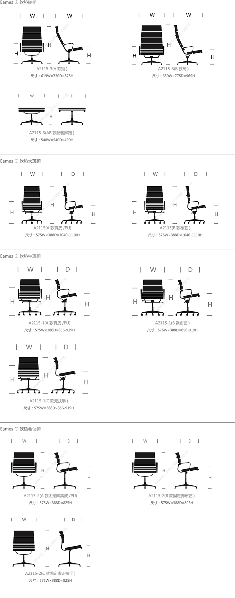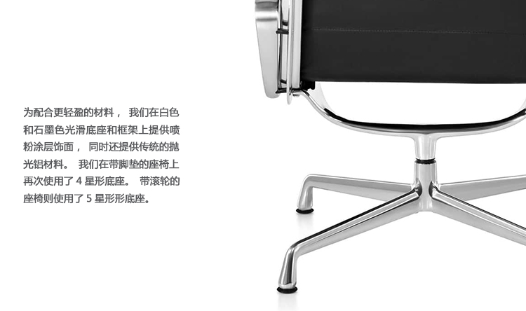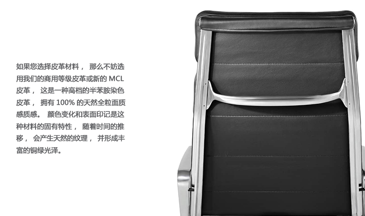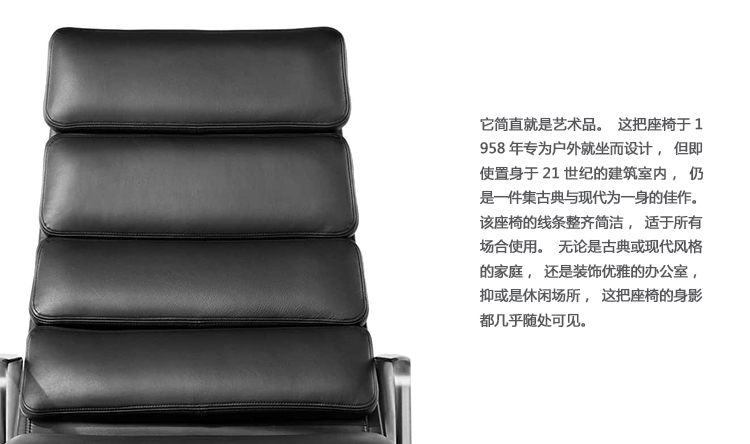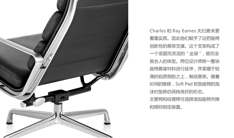 Charles与RayEames夫妇是20世纪最有影响力的火狐HUOHU(中国),卓越的设计涵盖了火狐官方网站、建筑、影像与平面设计。他们从二次世界大战中美国海军的实验计画中学习经验并发展可谓是现今工业中使用模铸胶合版的先锋,这对设计界的超级夫妇档自1940年参与了由MOMA举办的有机火狐官方网站设计大赛,自今已有近百件他们的作品被各大博物馆所永久典藏。Eames® Soft Pad Executive Chair(伊姆斯软包大班椅)是夫妻俩1958年设计的,是在全铝系列的基础上发展的另一系列Eames产品。舒适系列在全铝的椅架上增加了皮革制的柔软坐垫和靠背,高级铝合金制作,压模五星脚,可旋转。背垫和坐垫,采用西皮,具有透气性强,内部填充高密度定型绵,不易变形,不老化,依人体坐姿,符合人体工学,耐水及对人体无害等优势。椅子扶手选用优质电镀铝合金扶手,手感舒适,永久不生锈。转椅底盘为多功能底盘,可以保护使用者长时间坐用腿部健康,且作为高度可多定位调节。气压棒采用的气杆是正规厂家出产的外贸气杆,每一根气杆都有钢印,经过严格SGS检测的才可出厂,旋转、升降自如基本无声响,使用寿命长,可承受250kg,可升降数万次,将椅面调至与膝盖同高时,使用者坐下后双脚跟可垂直平放于地上,且大腿与地面平行,最符合人体工学理论,使用者长期久坐,也不想疲惫。办公椅脚为铝合金材质永久不生锈、承受能力强,安全更放心。椅子脚轮采用优质电镀片脚轮,耐用而美观,可以随意变换位置,贴心更方便,具有防震及防松脱,让椅子的安全性能更加可靠。