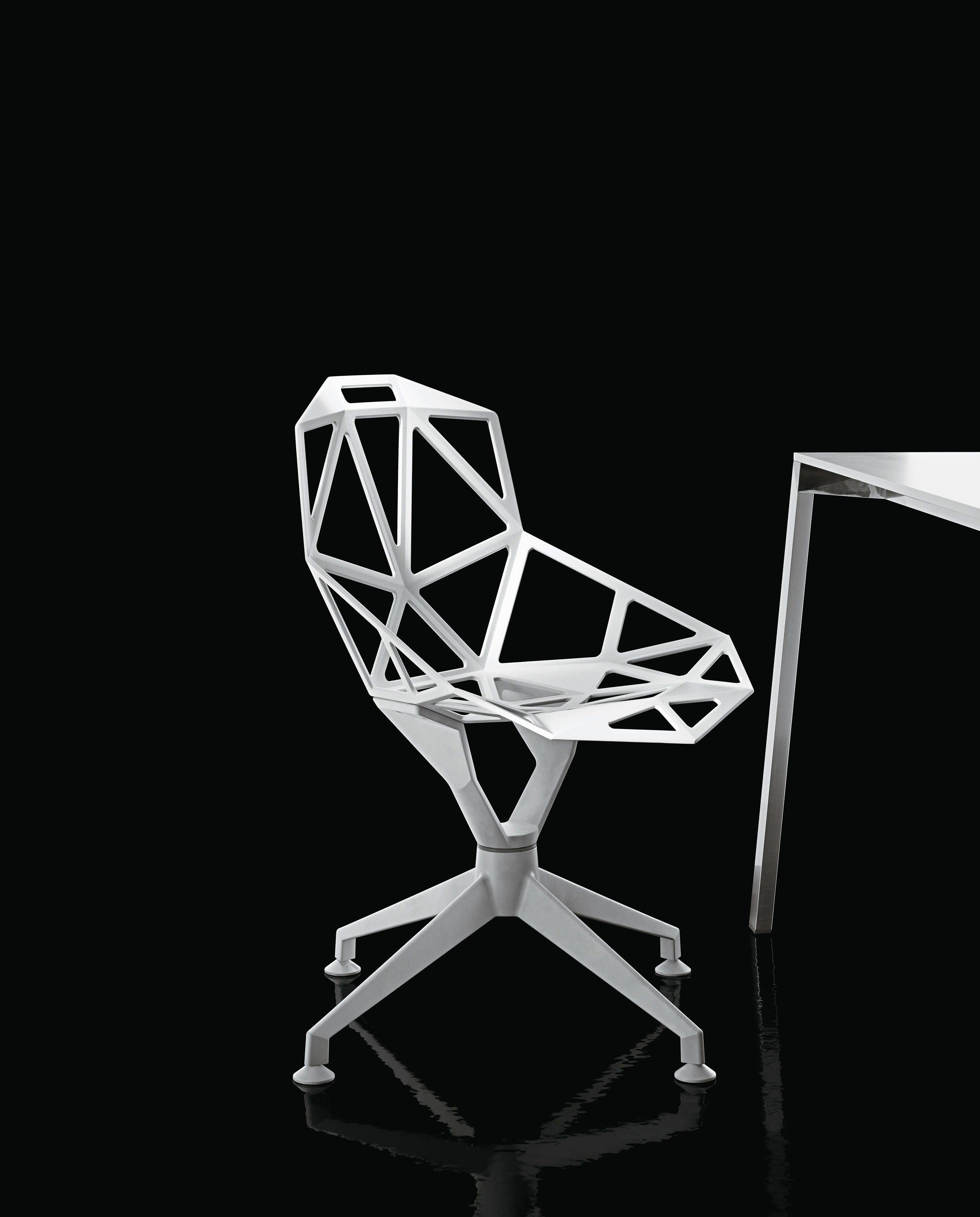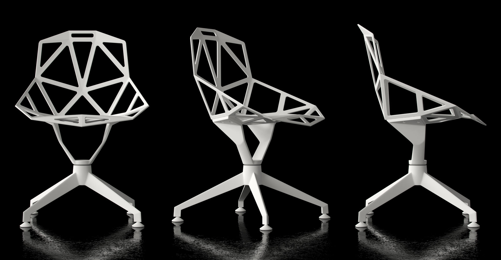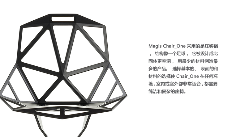 最受瞩目的德国火狐HUOHU(中国)Konstantin Grcic 应邀为MAGIS 设计的Chair One(几何吧椅),是设计生涯中最具有标志的产品之一。办公椅体为模铸铝合金结构,经过氟化钛镀膜与塑料粉末涂布。椅子具有阻燃性、抗腐蚀性。适合室内及室外使用。以铝金属与钛金属制成的 Chair One,以多个平面以不同角度组合而成,建立起立体的外型。多个中空的三角型组合而成的座椅,不但令为用家带来强而有力的承托结构,而且还能在简单设计之中带出不一样的风格。这把椅子的惊人形象难免使人对它的舒适度产生疑问,但当你真正坐于其上,你会发现它实际上非常舒适,那些稀疏的网状结构能够极好地支撑不同体型的人体,后背上的把手也非常实用。当你知道Chair-One最初是被当作户外用椅而设计的,你会更加佩服Konstantin Grcic的缜密用心:极少的表面可以杜绝雨水,并且减少灰尘堆积,夸张的形态则令它能够在街道、建筑或自然的环境中拥有自己美学上的存在,而不是被环境所吞没。Konstantin Grcic花了三年时间设计Chair One,自2003年诞生以来,堪称Grcic精简主义风格的代表作。2006年,Chiar One为Konstantin Grcic赢得了德国政府的设计大奖。