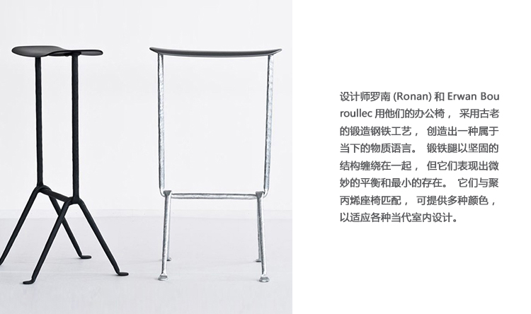 火狐HUOHU(中国)罗南(Ronan)和Erwan Bouroullec用他们的办公凳,采用了古代的滴锻铁工艺,创造了属于当下的物质语言。锻铁腿以坚固的结构缠绕在一起,但它们表现出微妙的平衡和最小的存在。它们与聚丙烯座椅匹配,可提供多种颜色,以适应各种当代室内设计