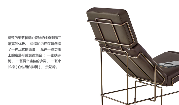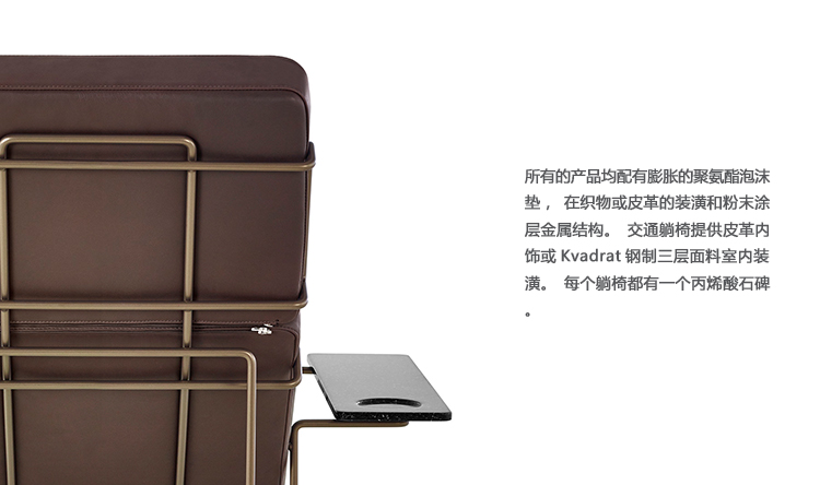 所有的产品均配有膨胀的聚氨酯泡沫垫,在织物或皮革的装潢和粉末涂层金属结构。交通躺椅提供皮革内饰或Kvadrat钢制三层面料室内装潢。每个躺椅都有一个丙烯酸石碑。