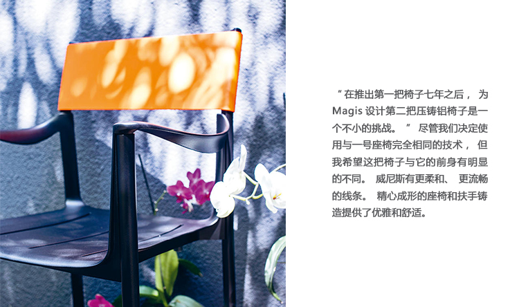 “在推出第一把椅子七年之后,为Magis设计第二把压铸铝椅子是一个不小的挑战。”尽管我们决定使用与一号座椅完全相同的技术,但我希望这把椅子与它的前身有明显的不同。威尼斯有更柔和、更流畅的线条。精心成形的座椅和扶手铸造提供了优雅和舒适。一个由柔性塑料模塑制成的靠背强调了椅子的类型学,并允许使用颜色和材料。康斯坦丁·Grcic