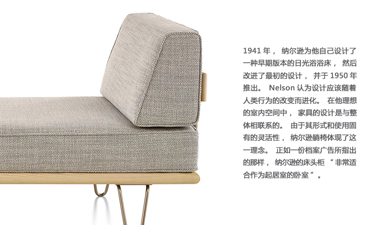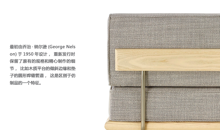 最初由乔治?纳尔逊(George Nelson)于1950年设计,重新发行时保留了原有的规格和精心制作的细节,比如木质平台的倾斜边缘和垫子的圆形焊缝管道,这是区别于仿制品的一个特征。不锈钢发夹腿或锥形木腿给它的经典纳尔逊触摸。缓冲增强了双密度泡沫,以更多的支持和耐久性,同时保持其轻质美学。随着住宅和公寓的面积不断缩小,纳尔逊牌(Nelson)躺椅等多功能火狐官方网站为任何房间增添了一种实用而精致的感觉。