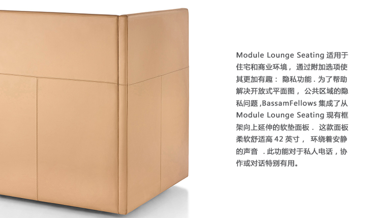 Module Lounge Seating适用于住宅和商业环境,通过附加选项使其更加有趣:隐私功能。为了帮助解决开放式平面图和公共区域的隐私问题,BassamFellows集成了从Module Lounge Seating现有框架向上延伸的软垫面板。这款面板柔软舒适,高42英寸,环绕着安静的声音。此功能对于私人电话,协作或对话特别有用。