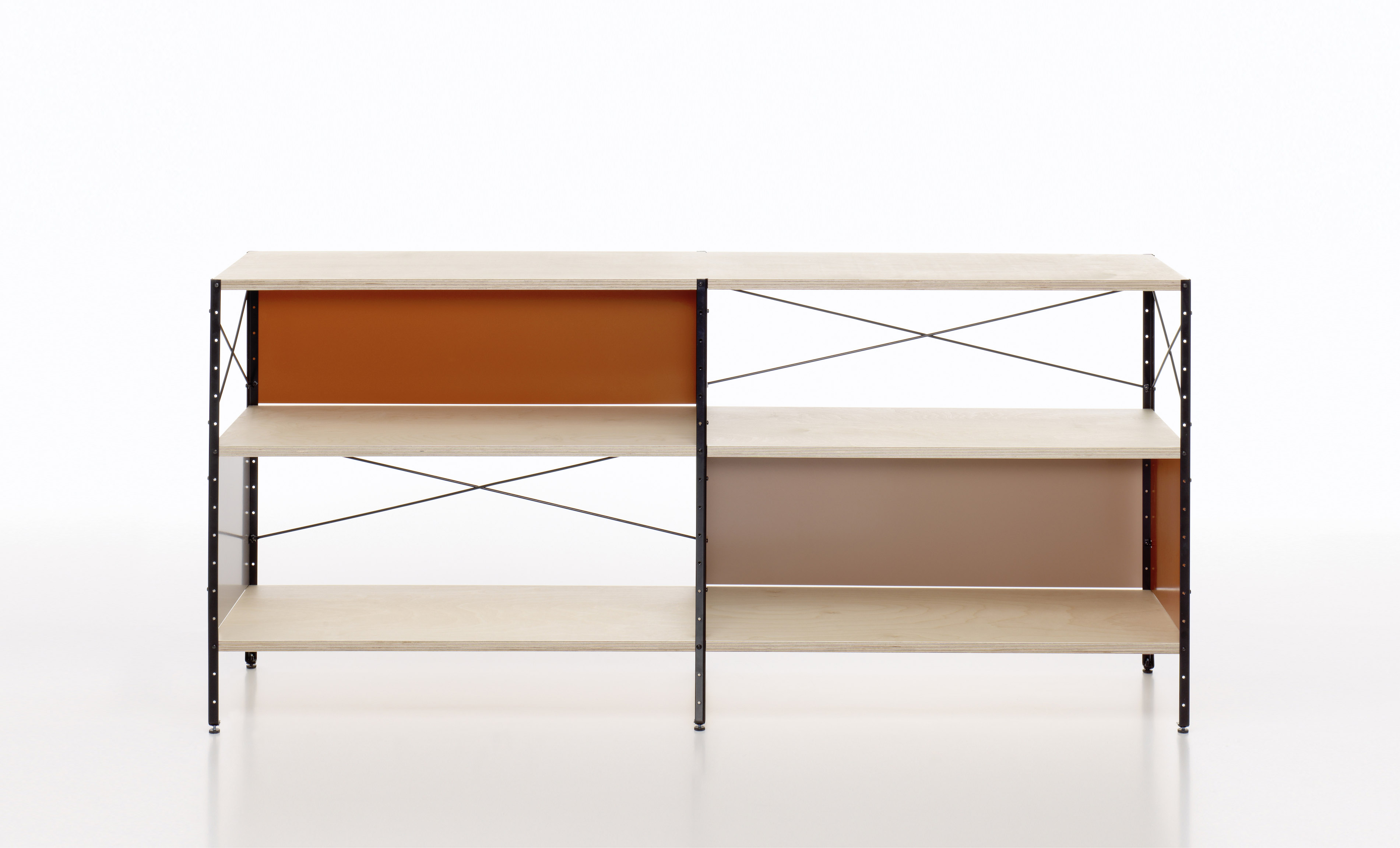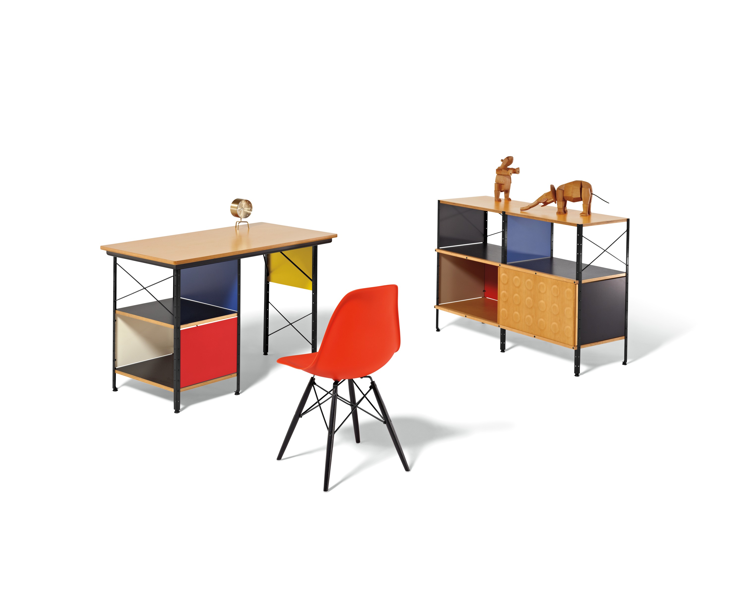 Eames存储单元由五种配置和四种大小的箱子、橱柜和抽屉组成。立柱、交叉支撑板和穿孔板要么是镀锌的,要么是黑色的;橱柜的正面是凹凸不平的胶合板;抽屉的正面和架子是模制的胶合板;箱体侧面和背面的面板是涂硬木的。可供您选择两种配色方案:中性色或亮色。