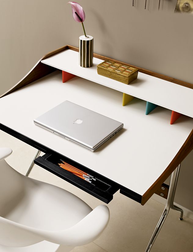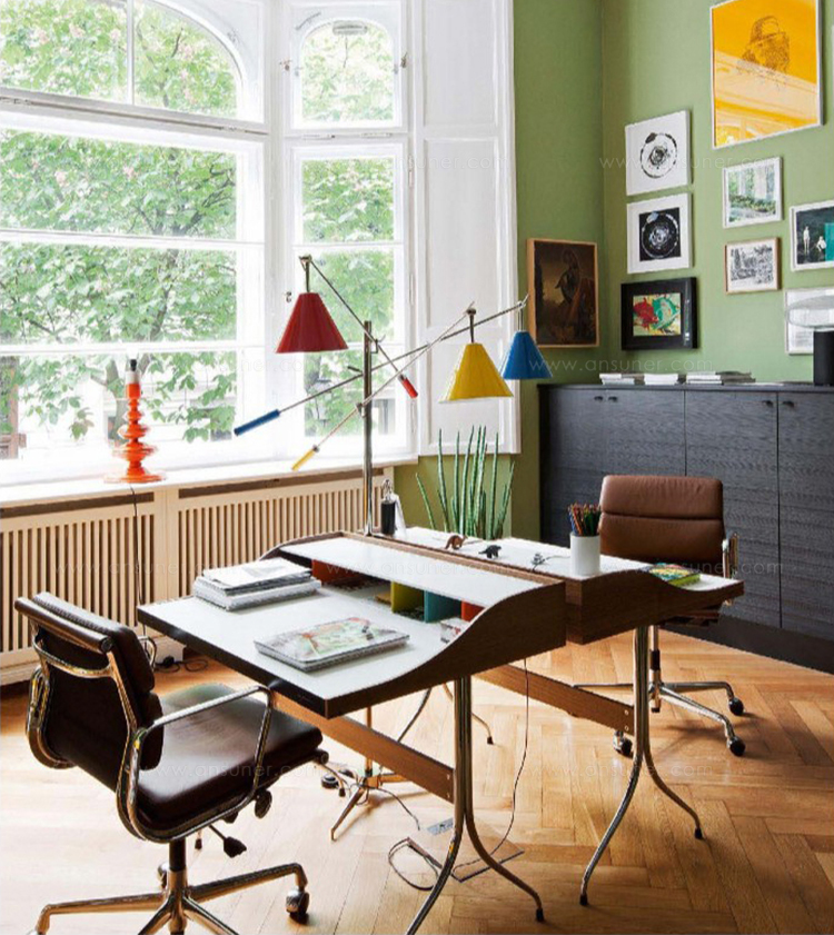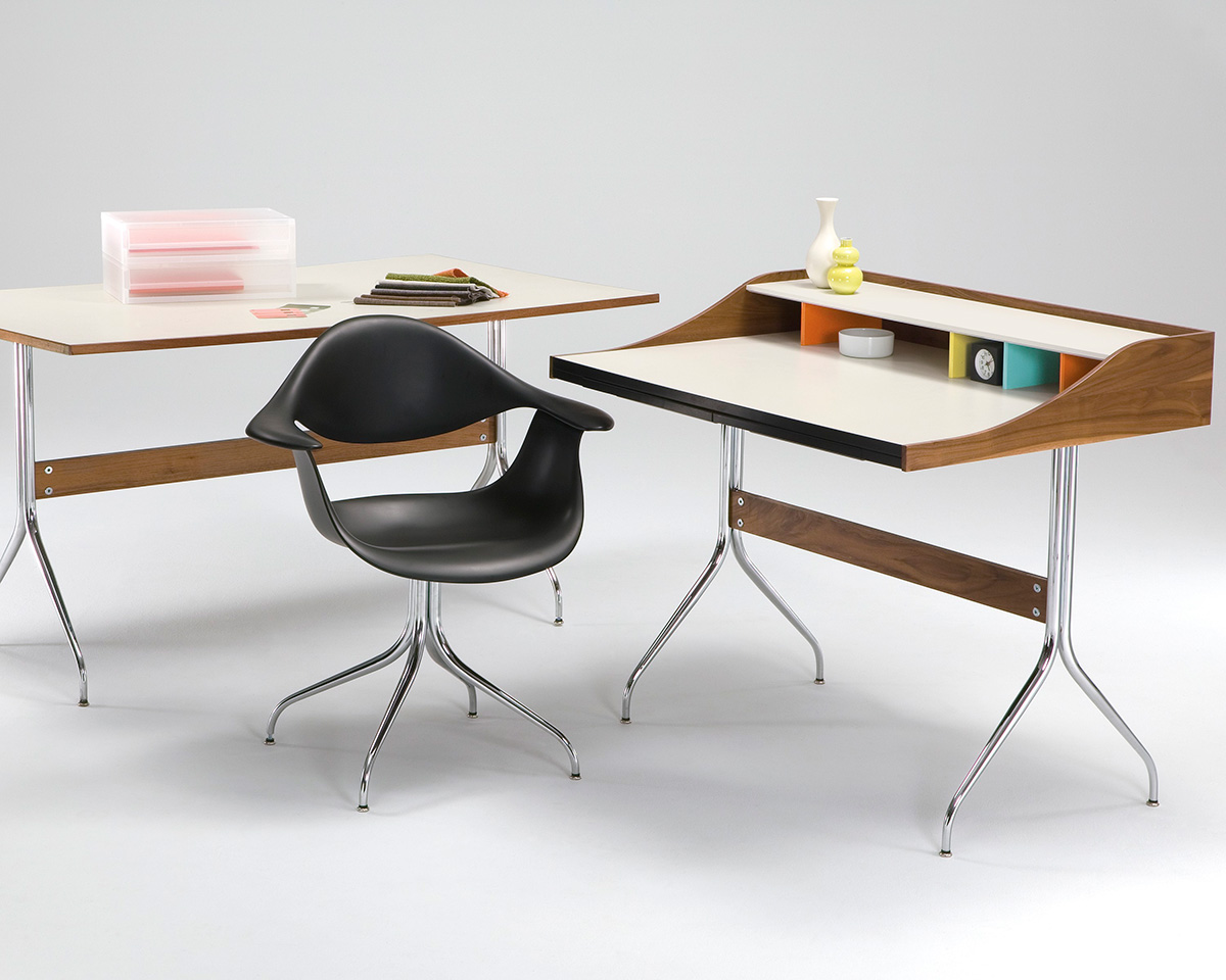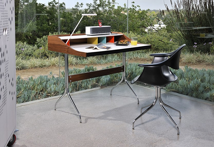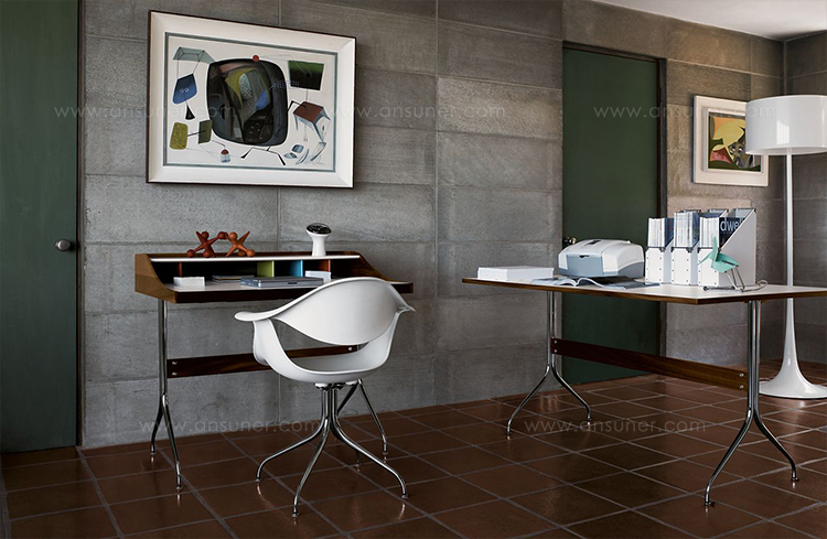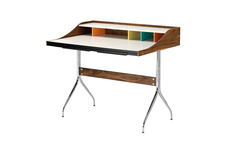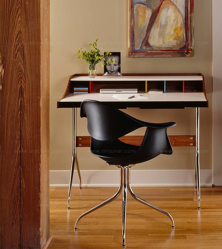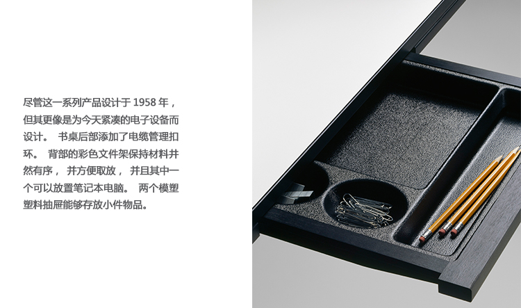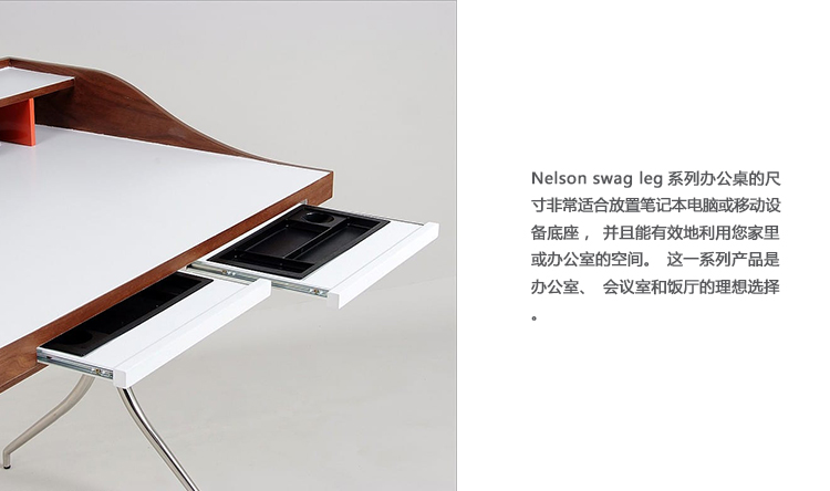 在George Nelson设计出Nelson swag leg系列产品50年后重新推出这款经典产品,主要是因为不管是其外观、尺寸还是功能都非常符合现代顾客的要求。这款办公桌的尺寸非常适合放置笔记本电脑或移动设备底座,并且能有效地利用您家里或办公室的空间。这一系列产品是办公室、会议室和饭厅的理想选择。