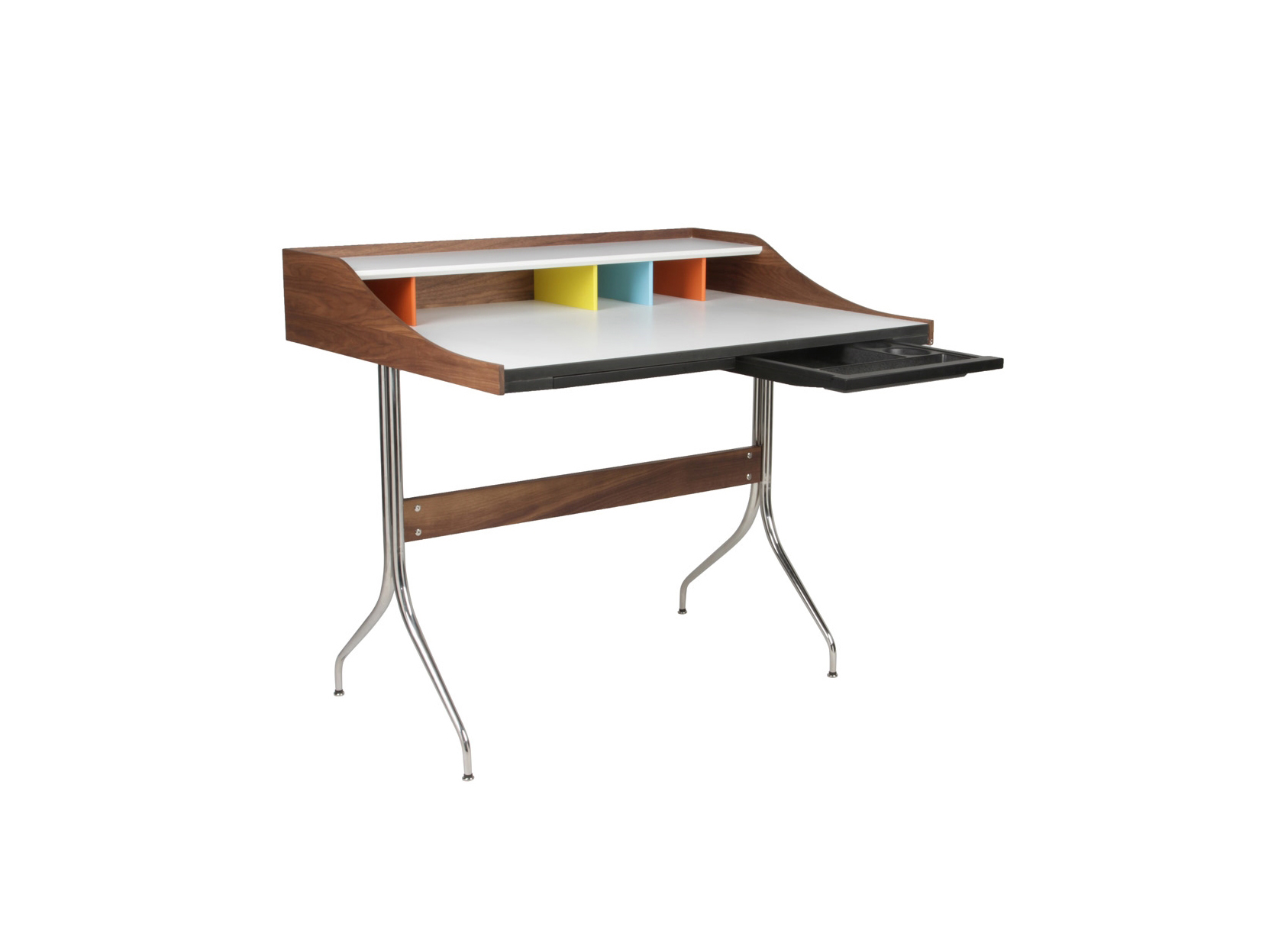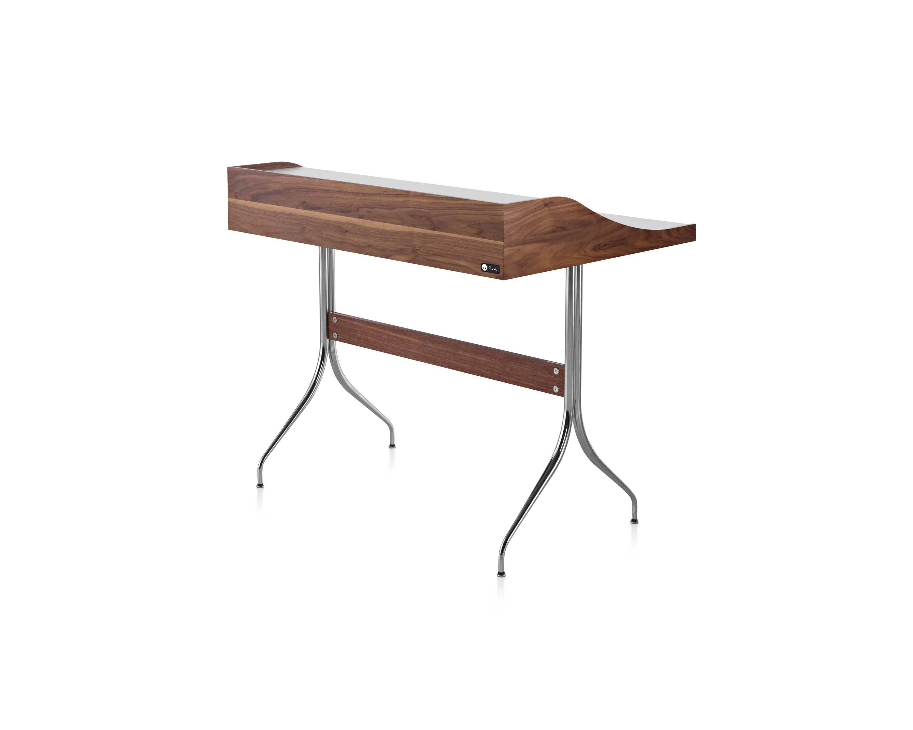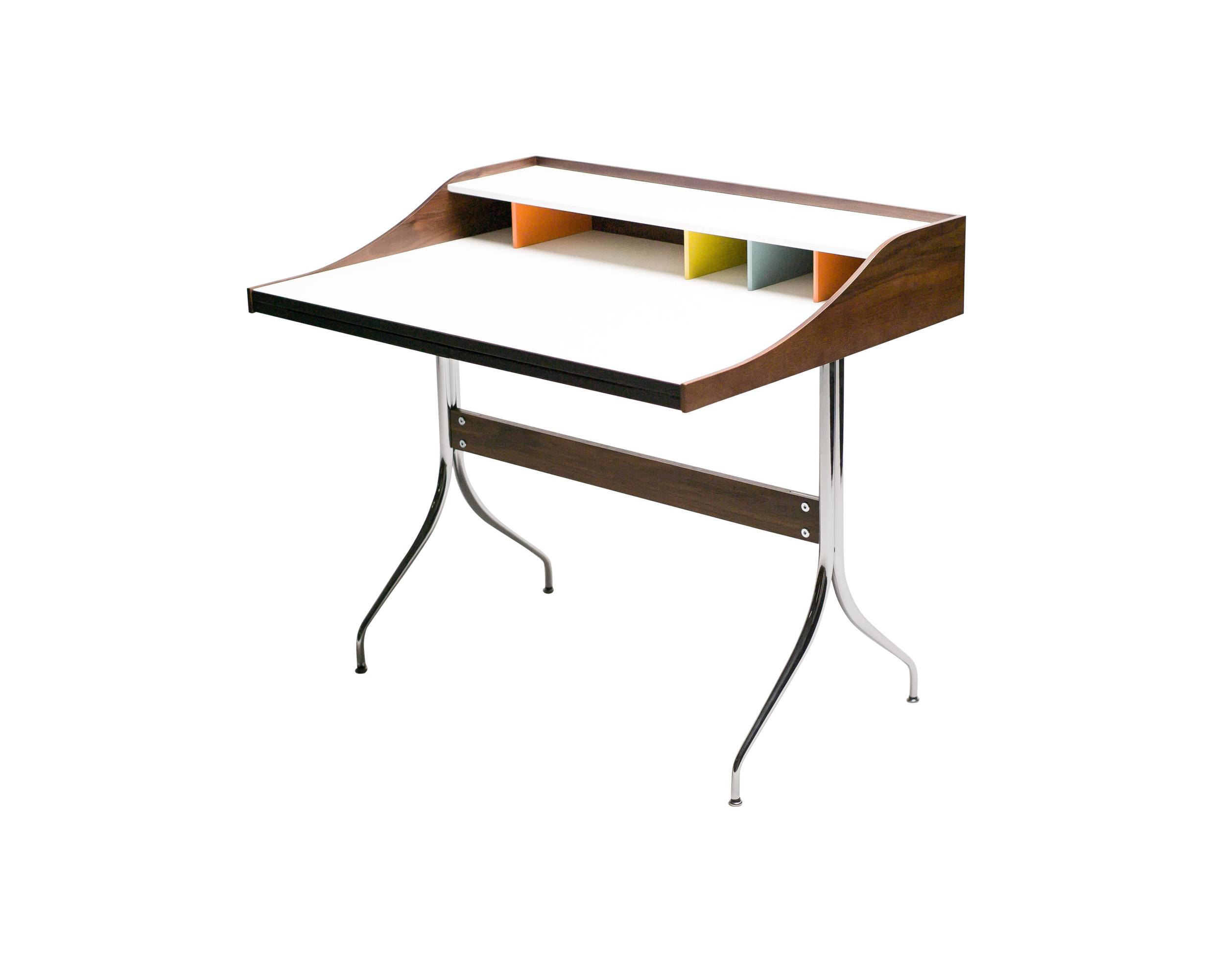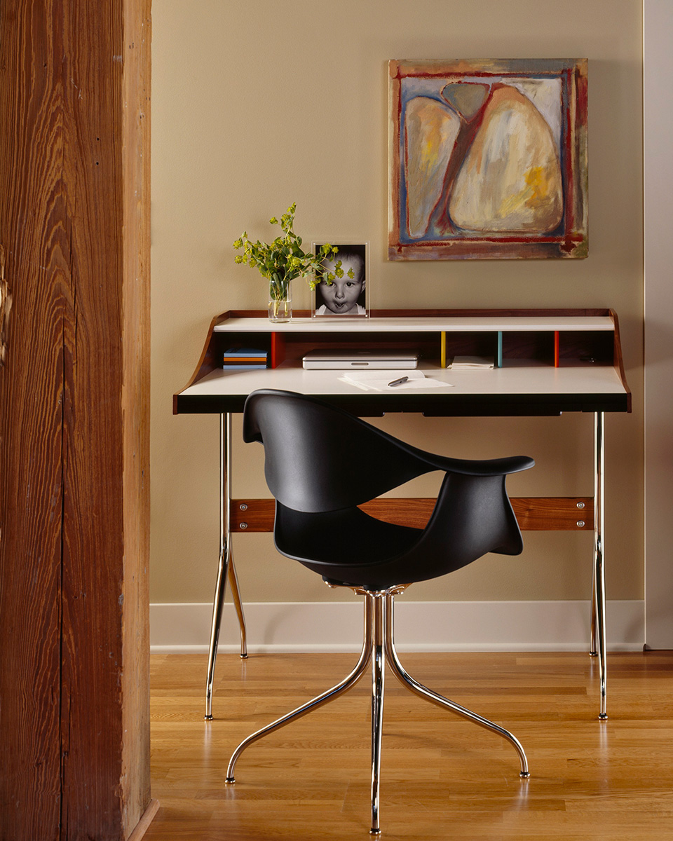 在George Nelson设计出Nelson swag leg系列产品50年后重新推出这款经典产品,主要是因为不管是其外观、尺寸还是功能都非常符合现代顾客的要求。这款办公桌的尺寸非常适合放置笔记本电脑或移动设备底座,并且能有效地利用您家里或办公室的空间。这一系列产品是办公室、会议室和饭厅的理想选择。