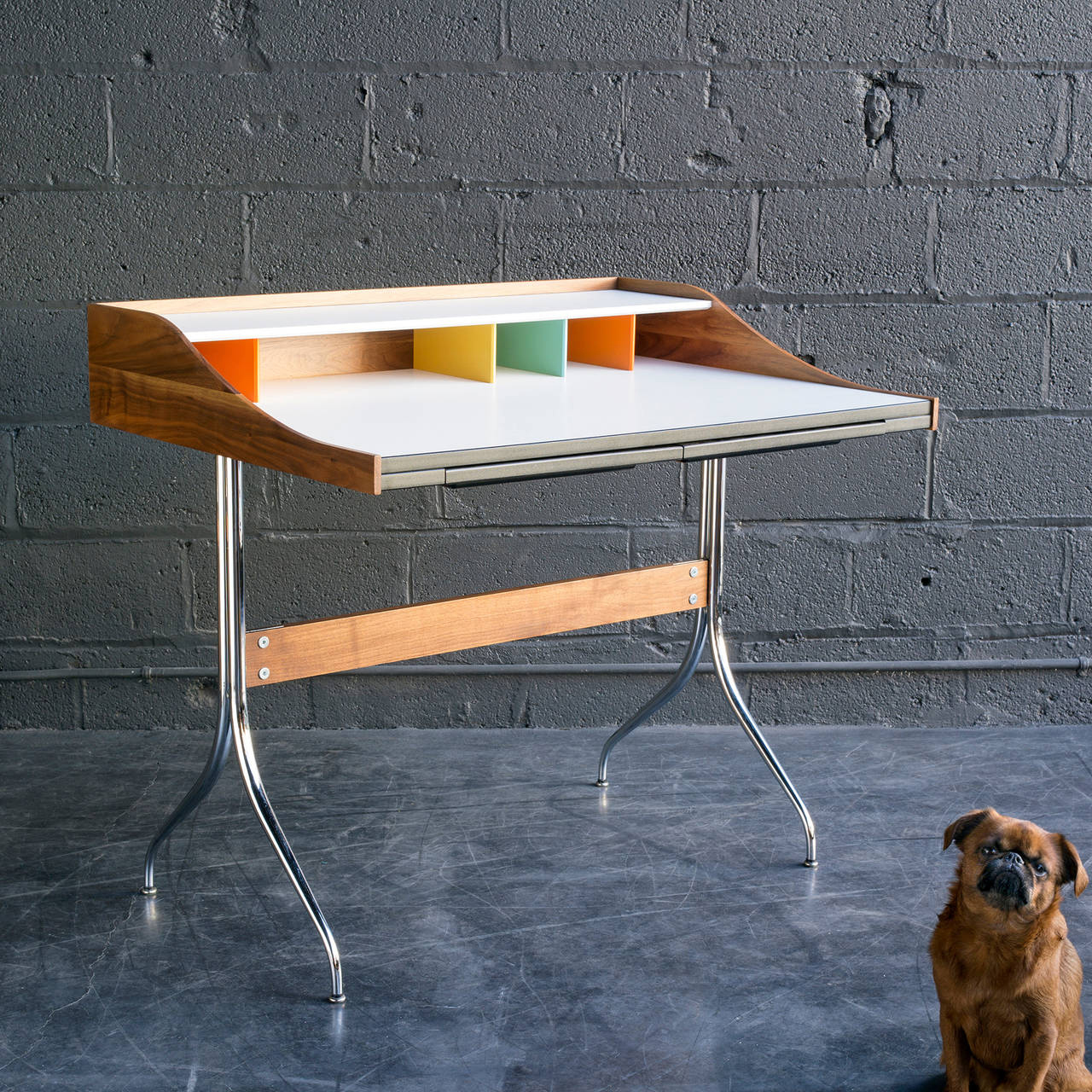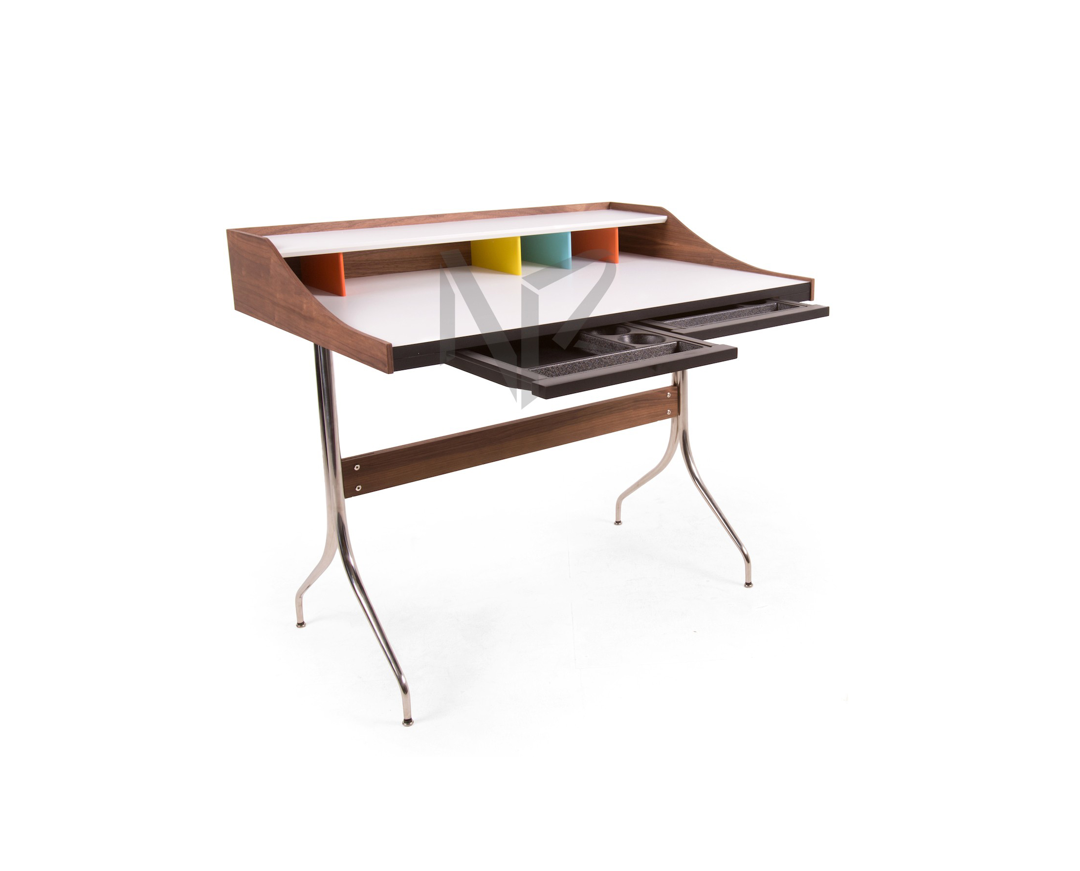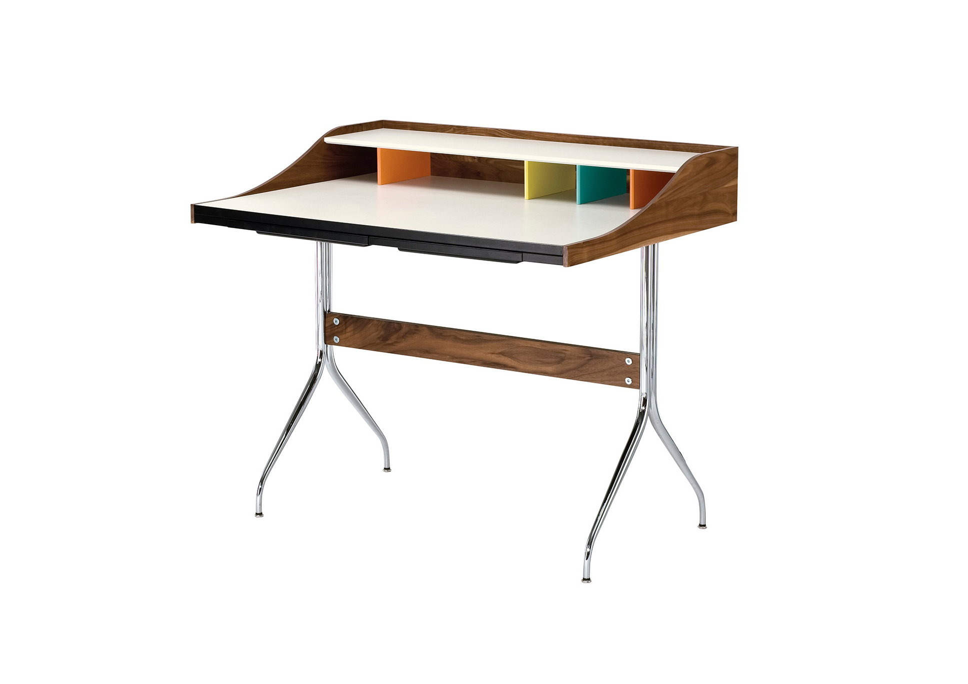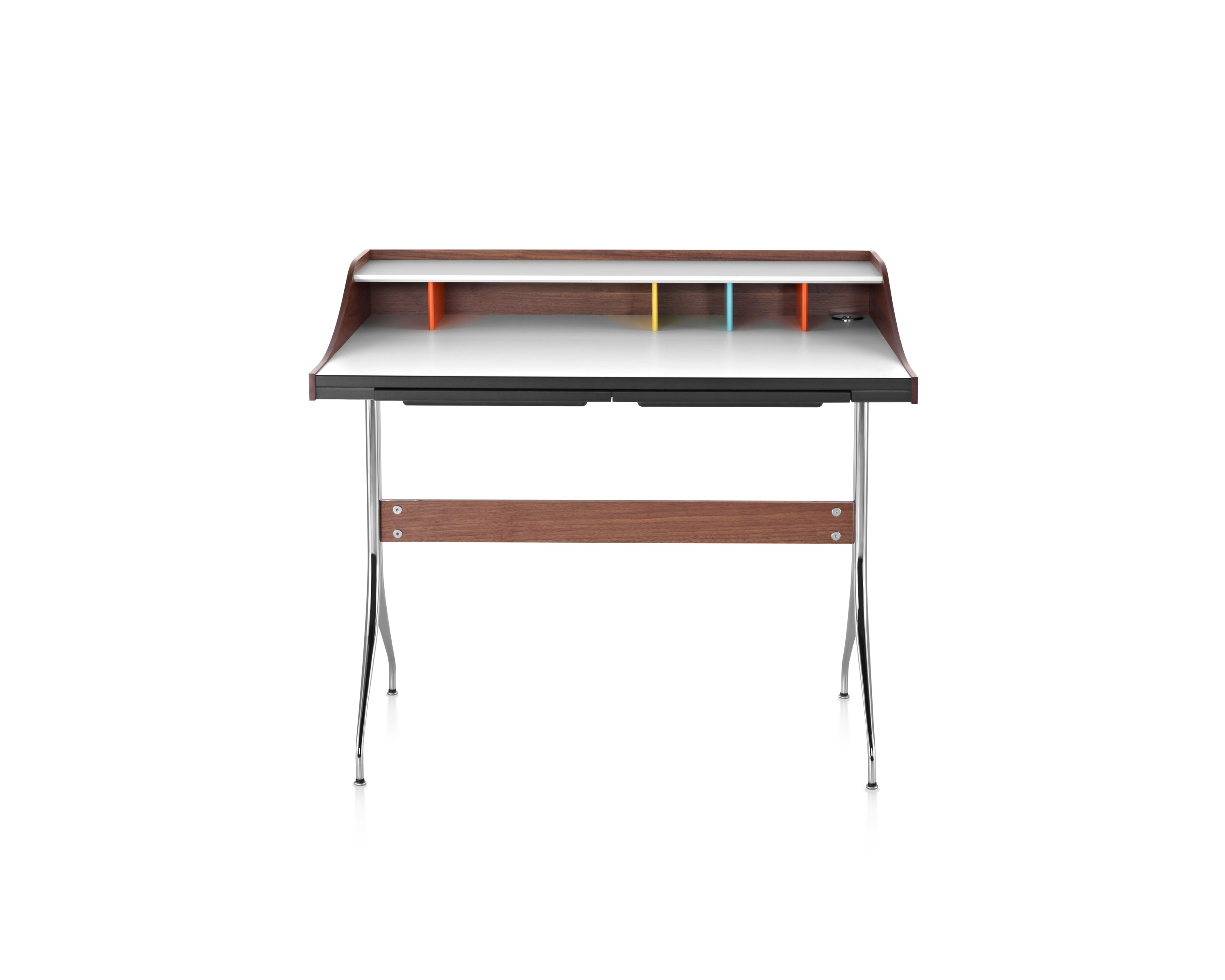 在George Nelson设计出Nelson swag leg系列产品50年后重新推出这款经典产品,主要是因为不管是其外观、尺寸还是功能都非常符合现代顾客的要求。这款办公桌的尺寸非常适合放置笔记本电脑或移动设备底座,并且能有效地利用您家里或办公室的空间。这一系列产品是办公室、会议室和饭厅的理想选择。