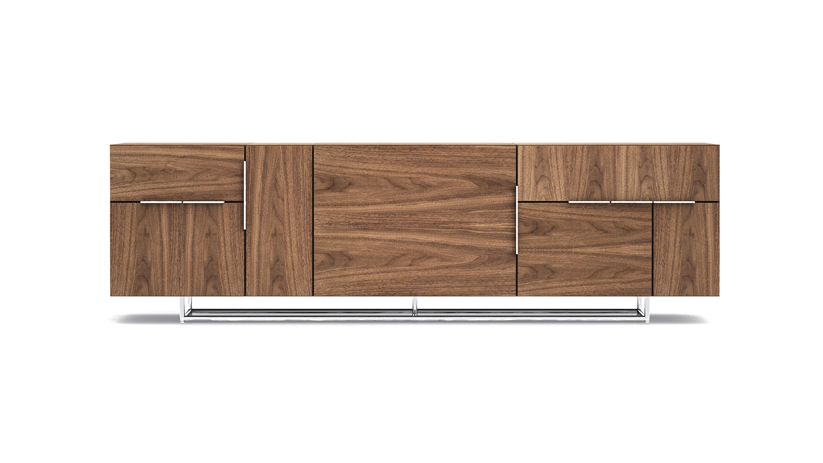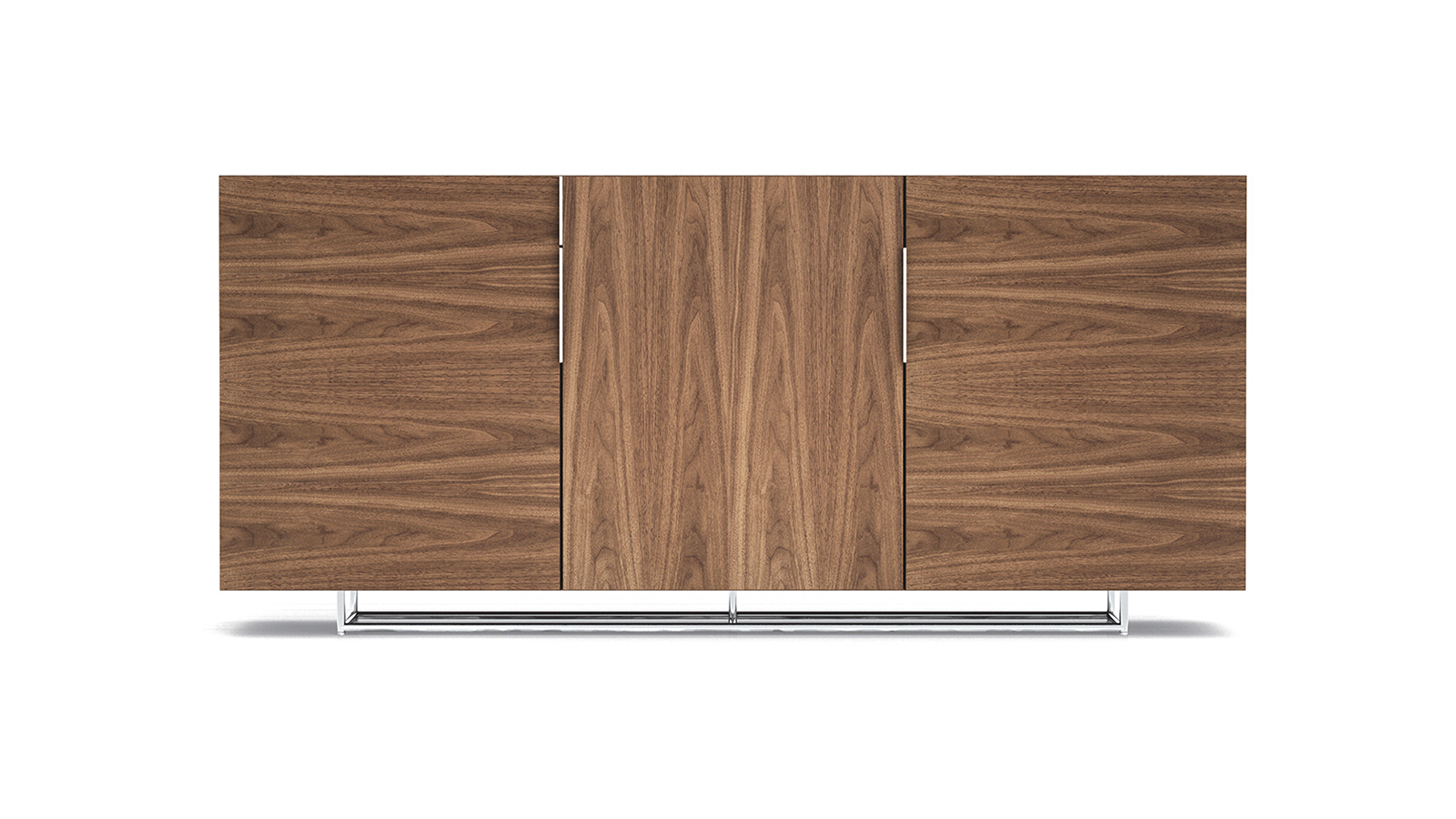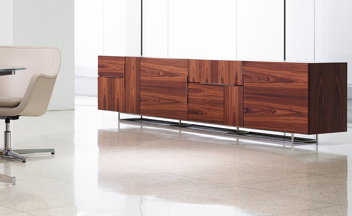 从内而外打造Domino系列绝不意味着Weinfeld忽视了外部的设计。精致的细节设计和工艺无处不在:从巧妙的胶合板到斜接转角。Domino系列方方面面都堪称完美,既可摆放在客厅和餐厅之间,也可安置在开放式办公室中。该系列可提供66.04厘米和101.6厘米两种高度选项,两单元、三单元或四单元宽度选项,以及六种格局选项。饰面采用胡桃木、巴西花梨木及黑檀木打造而成,镀铬或缎面镀铬镶边,内部采用坚固的水曲柳。