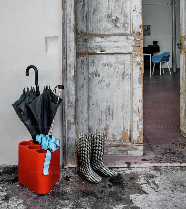 Magis的伞架允许长而短的雨伞在雨中冲入时容易弹出并存放。 其紧凑的尺寸和三角形的形状使其易于放置在入口通道或走廊中。 有橙色,白色和黑色可供选择。