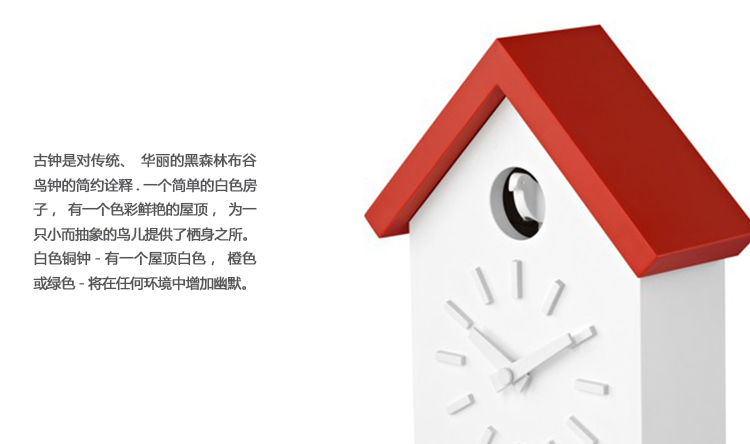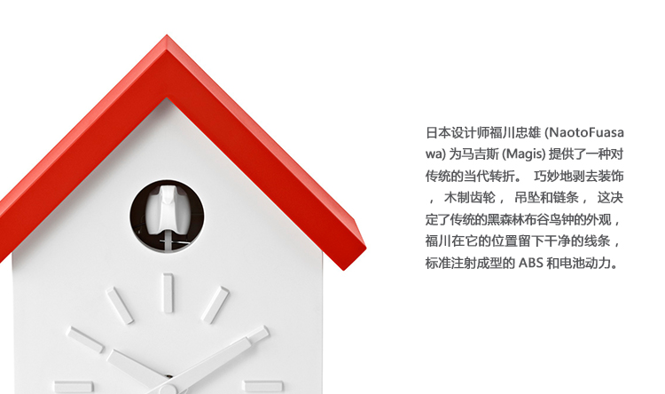 日本火狐HUOHU(中国)福川忠雄(NaotoFuasawa)为马吉斯(Magis)提供了一种对传统的当代转折。巧妙地剥去装饰,木制齿轮,吊坠和链条,这决定了传统的黑森林布谷鸟钟的外观,福川在它的位置留下干净的线条,标准注射成型的ABS和电池动力。古钟是对传统、华丽的黑森林布谷鸟钟的简约诠释.一个简单的白色房子,有一个色彩鲜艳的屋顶,为一只小而抽象的鸟儿提供了栖身之所。白色铜钟-有一个屋顶白色,橙色或绿色-将在任何环境中增加幽默。