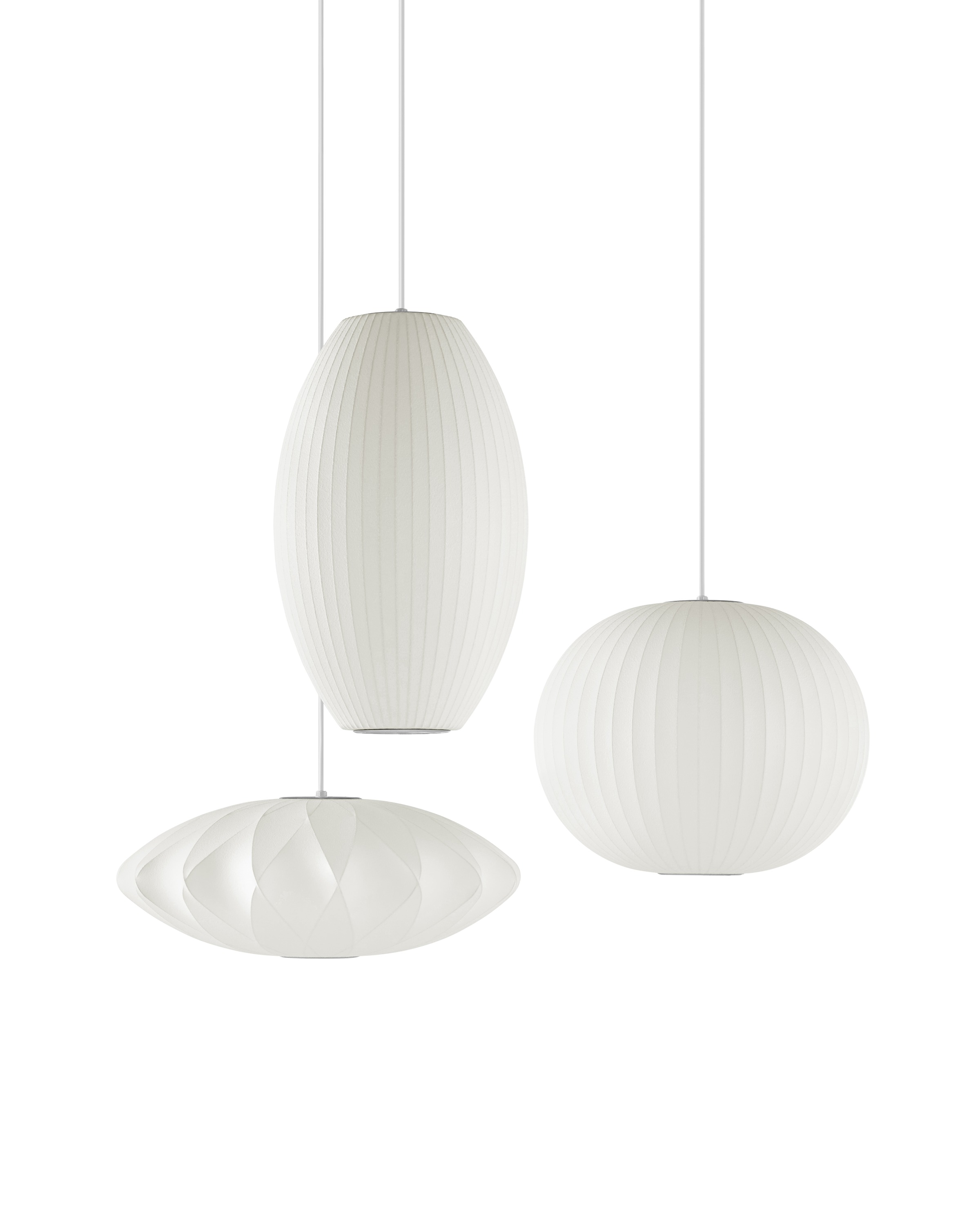 Nelson Cigar Bubble Pendant雪茄形气泡吊灯可以通过吊线板和6英寸长的吊绳悬挂在天花板上,散发出柔和均匀的光线。有小号、中号、大号和加大号几种不同规格。这些灯具最初生产于1952年,当时Nelson看到一组配有精心制作的丝质灯罩的瑞典吊灯,由此触发灵感。然而,吊灯的价格实在让人望而却步。Nelson决定设计制作自己的灯组,并且想出了用透明塑材代替真丝的创新工艺,使其能拥有更实惠的价格。