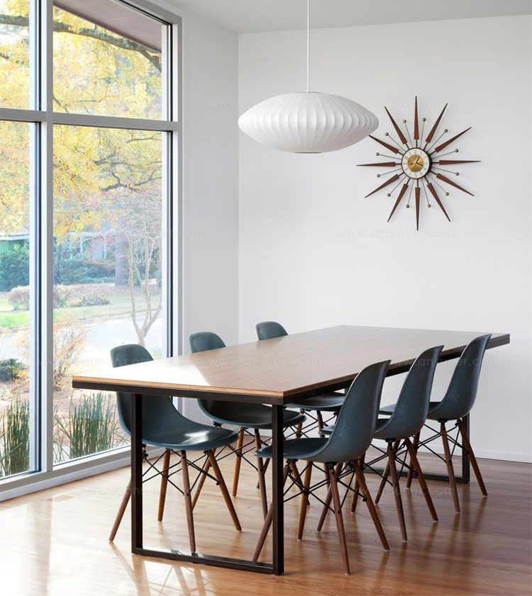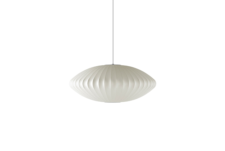 Nelson气泡灯是一组形形色色、具有球状轮廓的灯具,能散发出均匀柔和的光线。Nelson Saucer Bubble Pendant杯托型气泡吊灯宽大的形状及其不锈钢的下层结构能给人带来柔和流动的线条感,造型可爱,光线宜人,适合任何室内风格。本款吊灯有小号、中号、大号和加大号几种不同规格。George Nelson于1952年设计了这个系列的灯具,当时他偶然发现了一款瑞典吊灯,打算买回去放到自己办公室里使用。但那款吊灯高昂的价格让他犹豫了,却让他萌生出自己设计一个气泡灯系列的念头来。