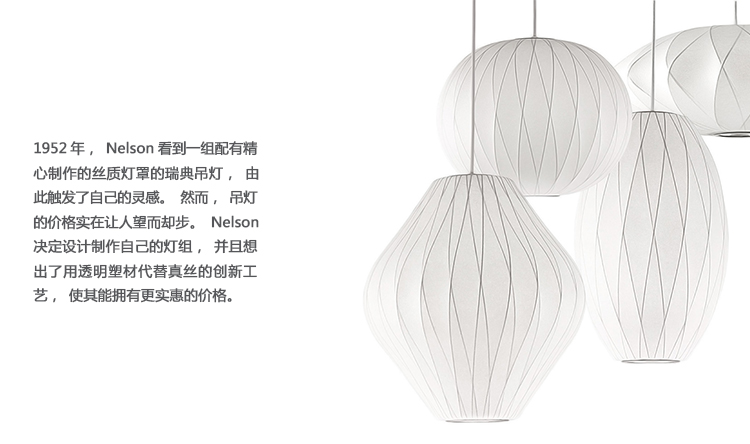 Nelson气泡灯造型多变,别具一格,其各种球状外形能为任何类型的室内设计增添一丝趣味。Nelson Ball Crisscross Bubble Pendant球形十字气泡吊灯浑圆的灯罩与其下层结构中对分的图案组合成一个非常有意思的轮廓。1952年,Nelson看到一组配有精心制作的丝质灯罩的瑞典吊灯,由此触发了自己的灵感。然而,吊灯的价格实在让人望而却步。Nelson决定设计制作自己的灯组,并且想出了用透明塑材代替真丝的创新工艺,使其能拥有更实惠的价格。