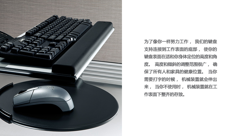 为了像你一样努力工作,我们的键盘支持连接到工作表面的底部,使你的键盘表面在适和你身体定位的高度和角度。高度和倾斜的调整范围很广,确保了所有人和火狐官方网站的健康位置。当你需要打字的时候,机械装置就会伸出来,当你不使用时,机械装置就在工作表面下整齐的储存