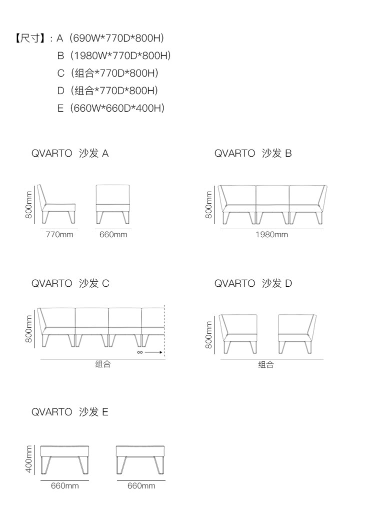 Qvarto -Qvarto是一个模块化沙发系统,由三个软垫部件和两个桌子组成。每件可单独使用,也可与Qvarto系列的其他产品组合使用。Qvarto可在许多不同的地方使用;等候室,大学,酒店等等。可链接。底架可在木材中使用r三个软垫部分;角,中部和凳子。木的内部框架。织物或皮革覆盖的聚醚泡沫内饰。铬钢底座。也可提供实心桦木或涂油橡木底架。座椅高度400毫米,总高度800毫米,座椅宽度660毫米/截面,座椅深度550毫米,总深度770毫米。