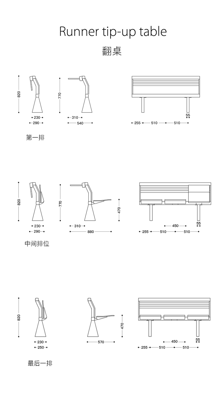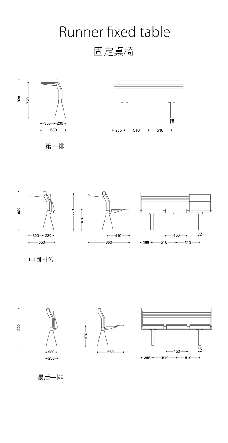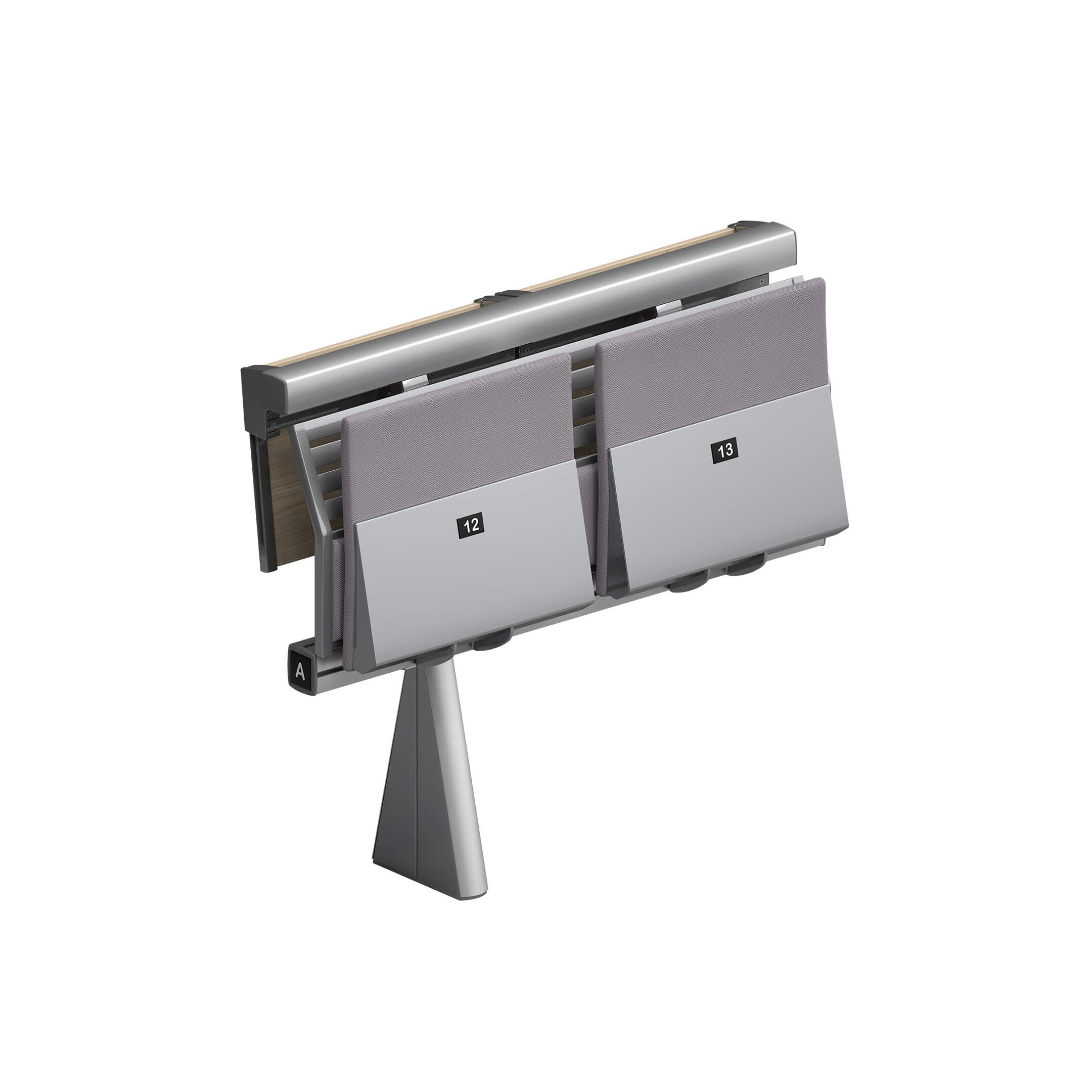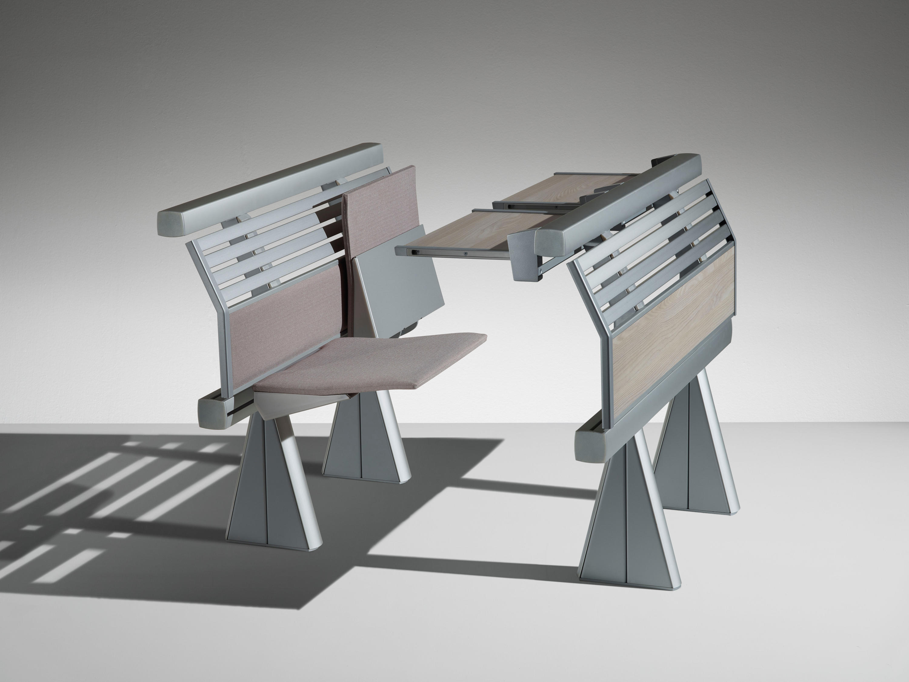 创新的座椅和桌子集成系统,采用新概念结构布局设计,简化装配操作,允许多种组合可能性。超越模块化,在克服与模块化相关的限制方面超越模块化,它允许无缝隙的连续形状,以流体水平线为特征,适合于均匀和舒适的学习或工作环境。最大自由的组合挤压阳极铝承重结构,有起拱作用和安装辅助元件(立柱、座椅、书写平板、支撑)的通道,无需钻孔或任何预定义的模块化,以保证结构的最大构图自由,甚至在安装过程中。安装可以是一条直线,曲线,在台阶上,也可以是在倾斜地板上(座椅之间的中心到中心距离可以调整)。靠背和座椅连续靠背版本由板条和挤压的、阳极化的铝型材制成,上部和下部采用双叠层或贴面的中密度纤维板。单靠背版采用山毛榉胶合板。两种版本都可以用织物或生态皮革填充和覆盖。Tip-向上座椅自动靠背,并与靠背进行协调。人机工程学设计的后座是按照脊柱的解剖结构设计的,无论使用何种安装配置,都能提供适当程度的舒适性:在水平地板上,在大台阶上,在直线或弯曲的行上。