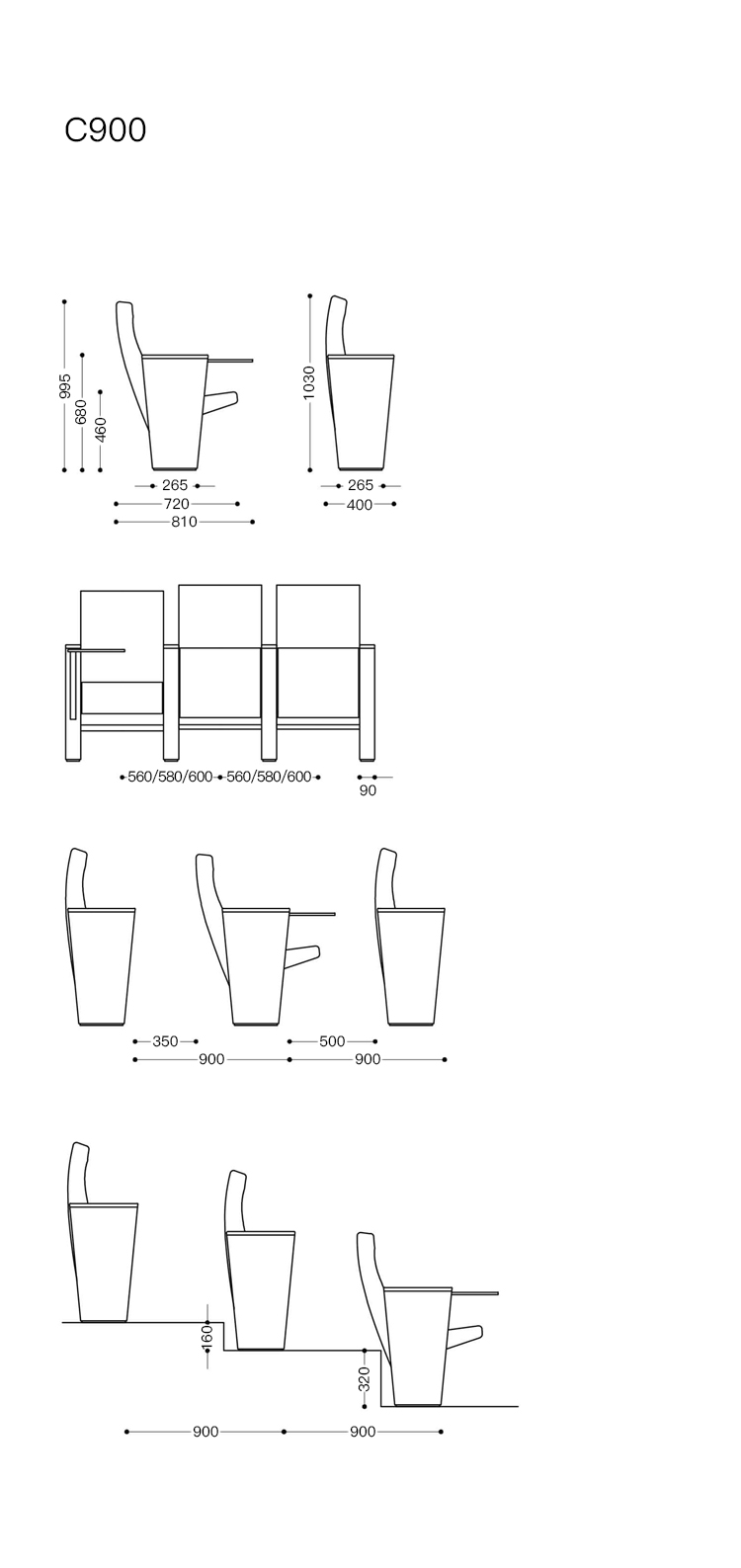 C900椅子着重于设计和舒适性,获得专利的同步座椅和靠背关闭系统减少了混乱,提供了更大的活动自由度,从而获得了更舒适,更舒适的座椅。C900椅子具有可定制的座椅和带清漆木板的靠背。侧翼采用聚丙烯板覆盖的模压板结构,并带有皮革或织物覆盖物的阻燃膨胀聚氨酯衬垫。C900椅子可以直排或半圆放置在架子,露台,水平地板或倾斜地板上。它具有配件:后面板靠背热塑性塑料,可伸缩或可折叠的书写板,编号位置。