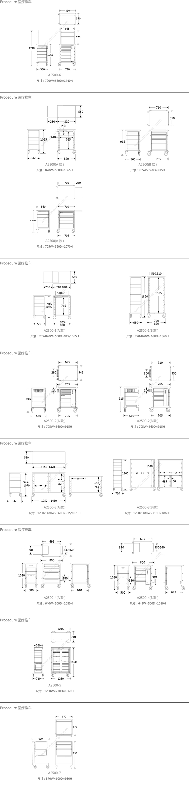 Procedure 医疗推车 系列尺寸/示意图