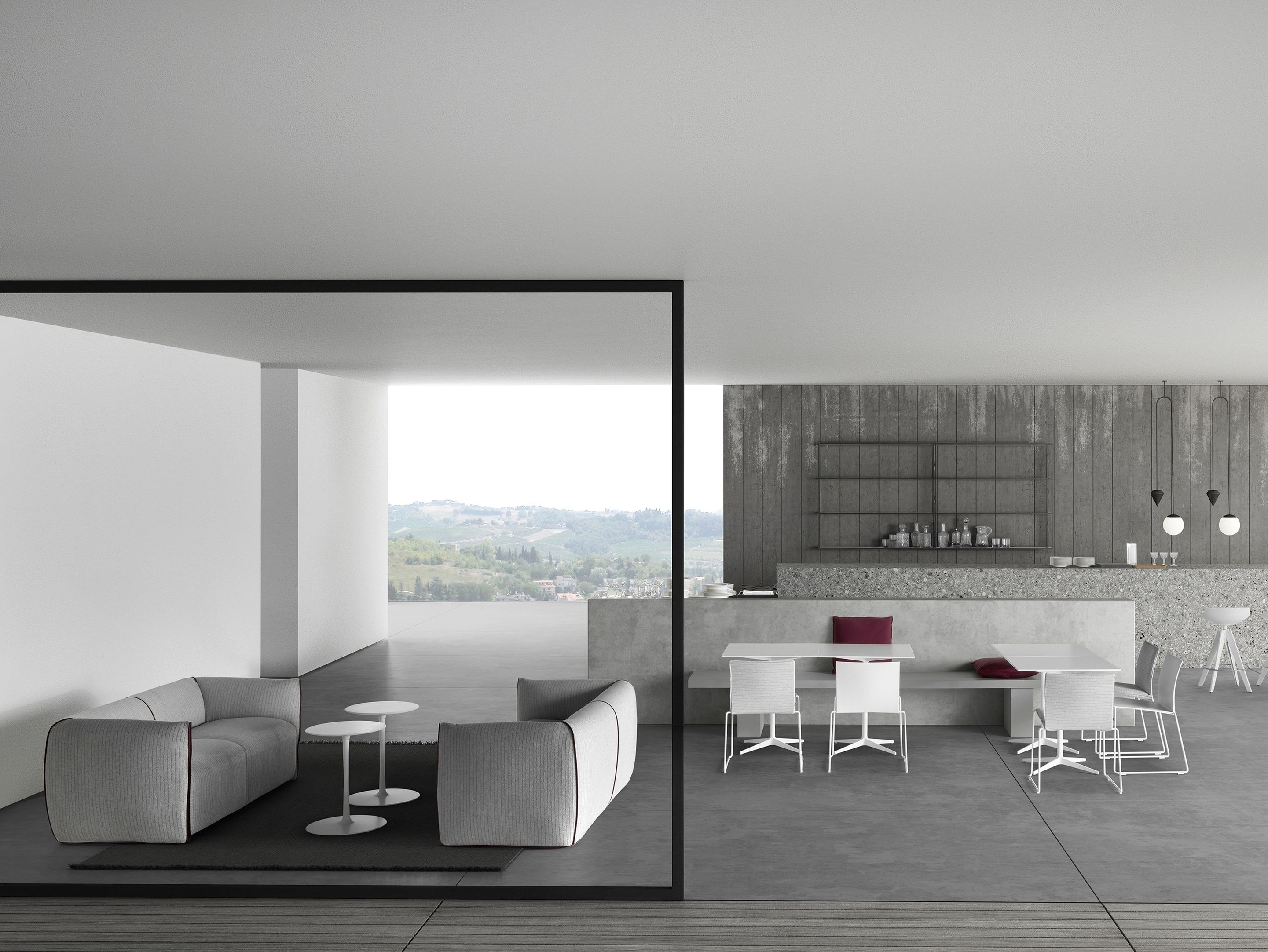一种茶几,中央有支腿,其特征在于顶部和框架的色彩连续性。框架:钢制中央支腿和铸铝四点星形底座,表面涂有哑光白色或石墨灰色。 顶部由高压HPL层压板(白色或黑色)或白色树脂制成。 该桌子适合户外使用。