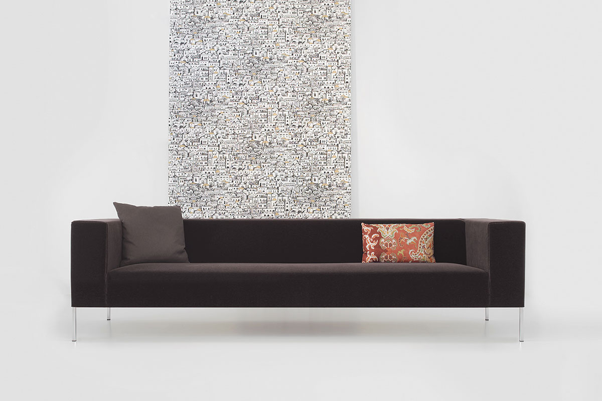 沙发和分区系统。实木和钢制框架中覆盖有可变密度的聚醚。镀铬脚,高19厘米。 使用没有左右扶手的元素,除了带有一个扶手的沙发之外,还可以创建巨型沙发或转角单元。