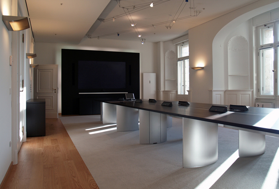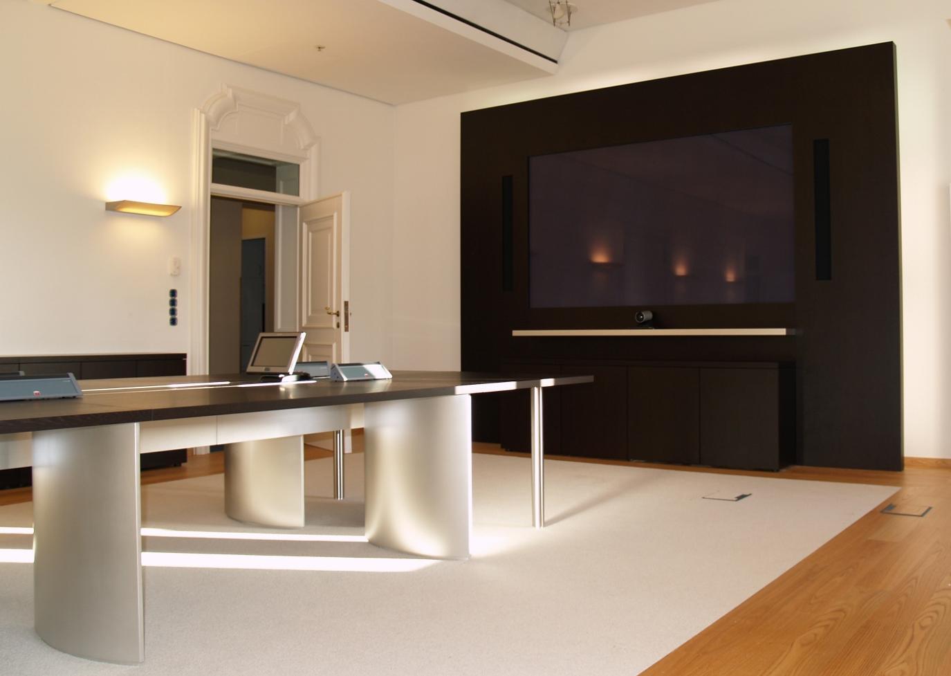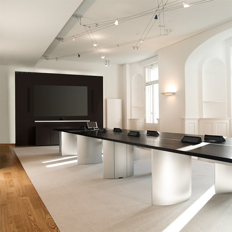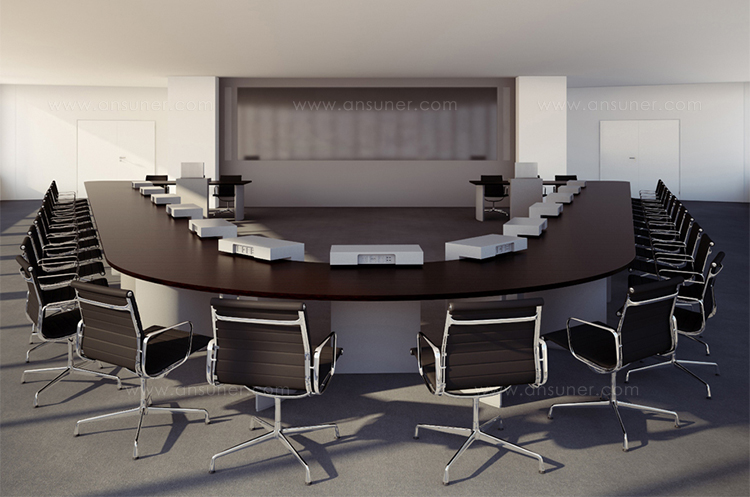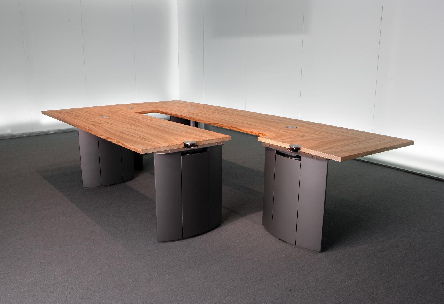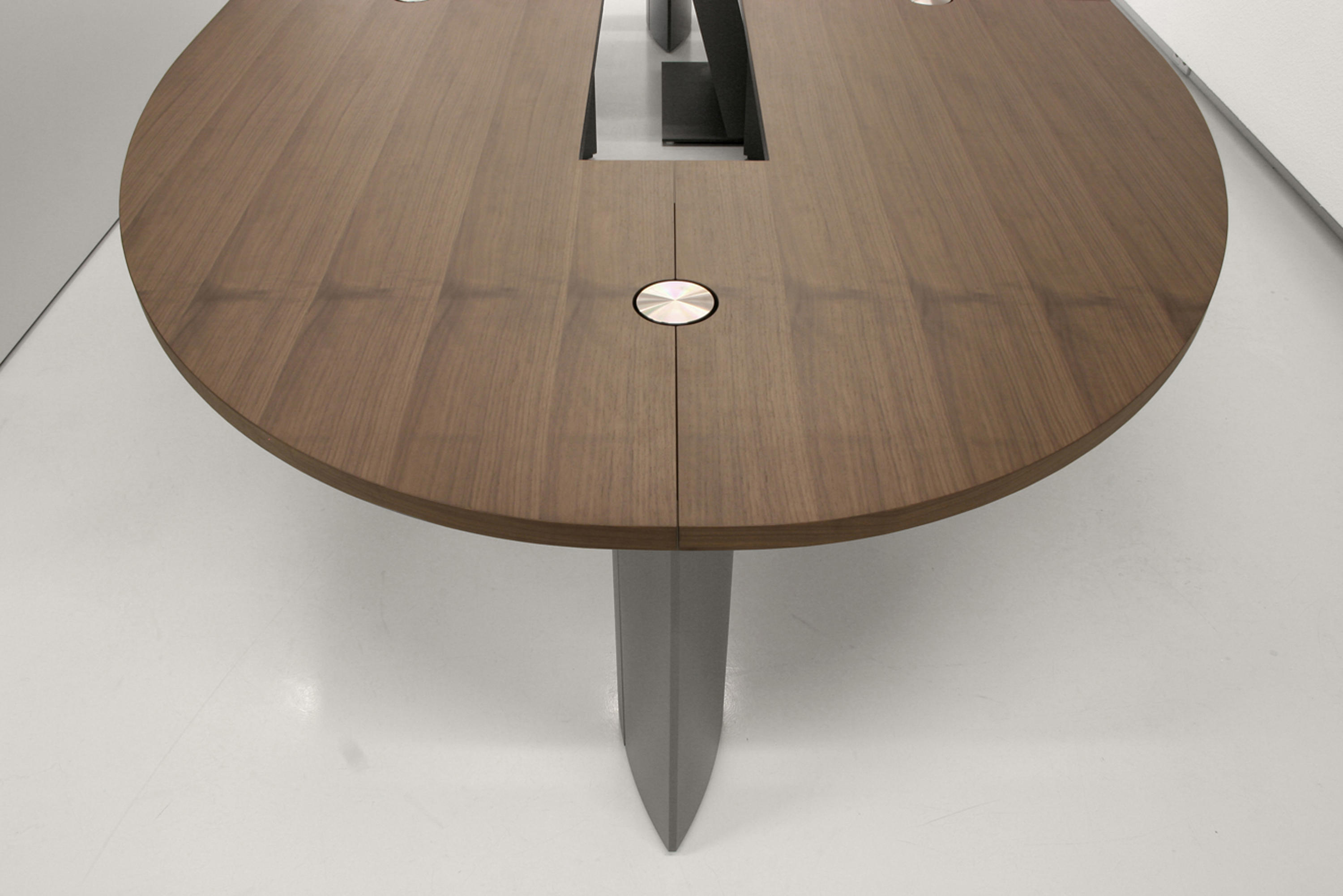 灵活的可变型会议桌系统,看上去像是固定安装的会议桌,且非常稳固。椭圆形的桌腿无需借助任何工具可在短时间内轻松组装和拆卸。32mm厚的桌面、可根据客户需要定制其形状和大小。椭圆形的桌腿可隐藏技术集成和走线系统。