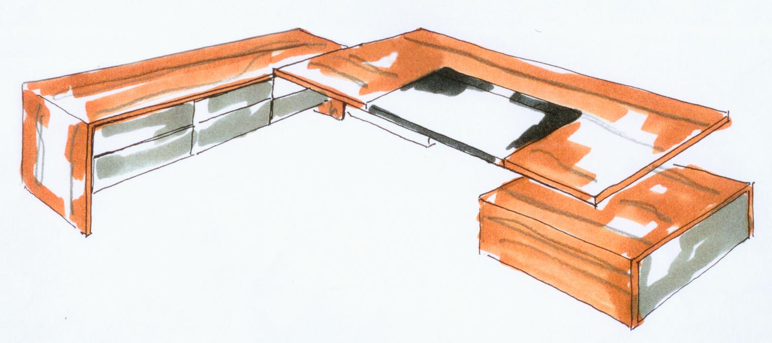 左副台带主机柜;左副台抽屉中可安装笔记本底座;右副台为储物柜.