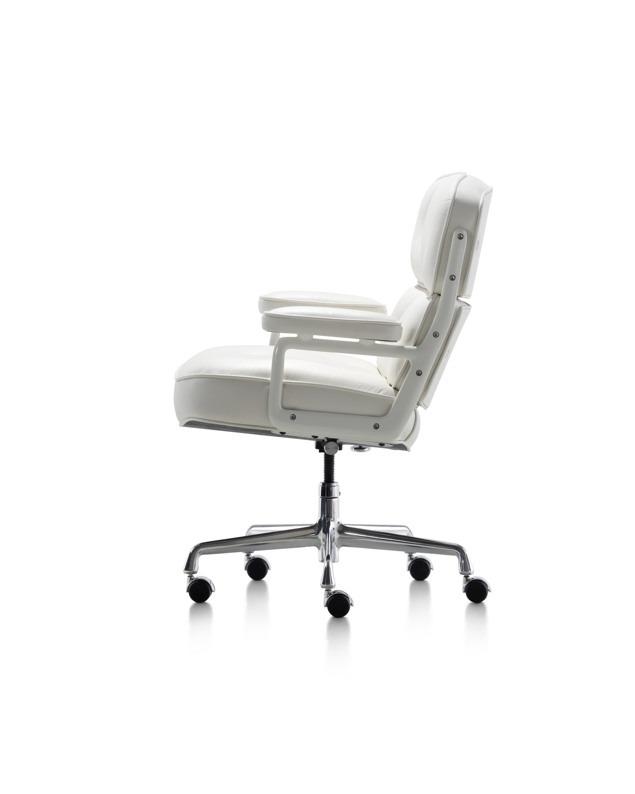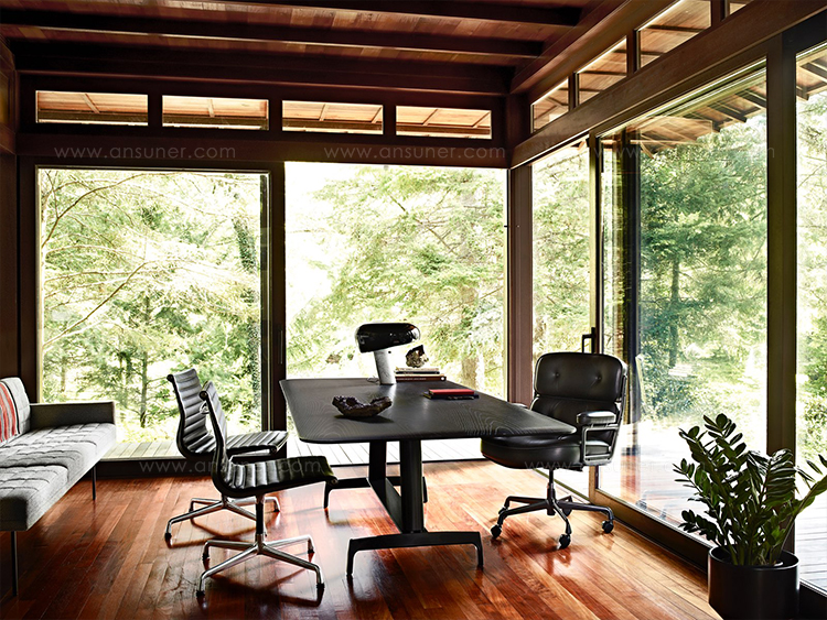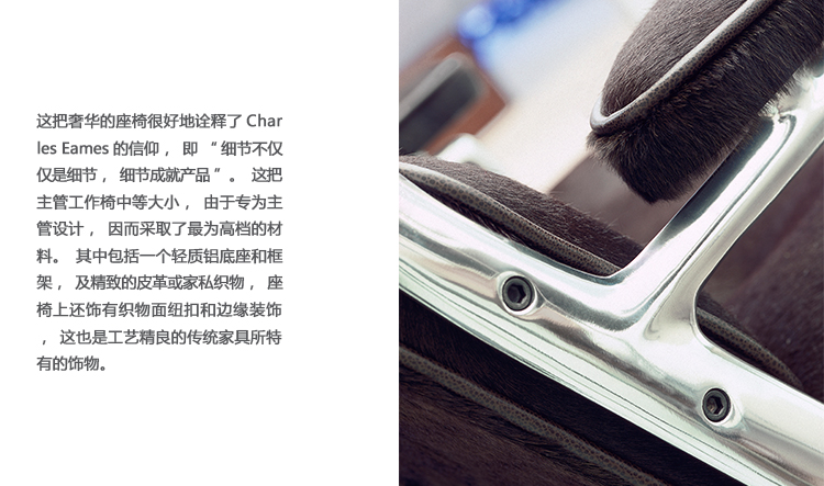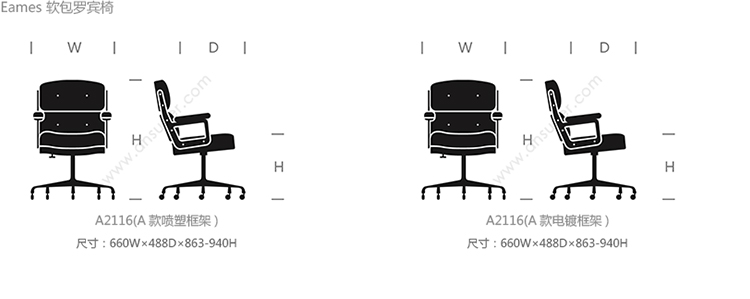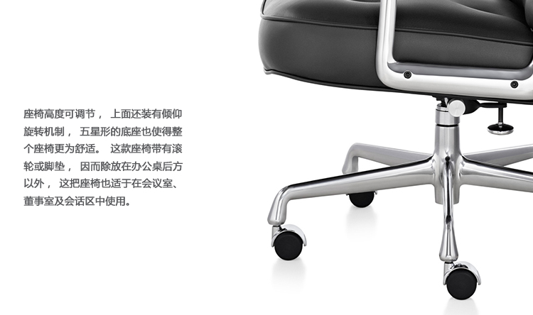 Charles与RayEames夫妇是20世纪最有影响力的火狐HUOHU(中国),卓越的设计涵盖了火狐官方网站、建筑、影像与平面设计。他们从二次世界大战中美国海军的实验计画中学习经验并发展可谓是现今工业中使用模铸胶合版的先锋,这对设计界的超级夫妇档自1940年参与了由MOMA举办的有机火狐官方网站设计大赛,自今已有近百件他们的作品被各大博物馆所永久典藏。 Eames® Soft Pad Side Chair(伊姆斯软包会议椅)是夫妻俩1958年设计的,是在全铝系列的基础上发展的另一系列Eames产品。舒适系列在全铝的椅架上增加了皮革制的柔软坐垫和靠背,高级铝合金制作,压模四星脚,可旋转。背垫和坐垫,采用西皮,具有透气性强,内部填充高密度定型绵,不易变形,不老化,依人体坐姿,符合人体工学,耐水及对人体无害等优势。椅子扶手选用优质电镀铝合金扶手,手感舒适,永久不生锈。转椅底盘为多功能底盘,可以保护使用者长时间坐用腿部健康,且作为高度可多定位调节。气压棒采用的气杆是正规厂家出产的外贸气杆,每一根气杆都有钢印,经过严格SGS检测的才可出厂,旋转、升降自如基本无声响,使用寿命长,可承受250kg,可升降数万次,将椅面调至与膝盖同高时,使用者坐下后双脚跟可垂直平放于地上,且大腿与地面平行,最符合人体工学理论,使用者长期久坐,也不想疲惫。办公椅脚为铝合金材质永久不生锈、承受能力强,安全更放心。椅子脚轮采用优质电镀片脚轮,耐用而美观,可以随意变换位置,贴心更方便,具有防震及防松脱,让椅子的安全性能更加可靠。
